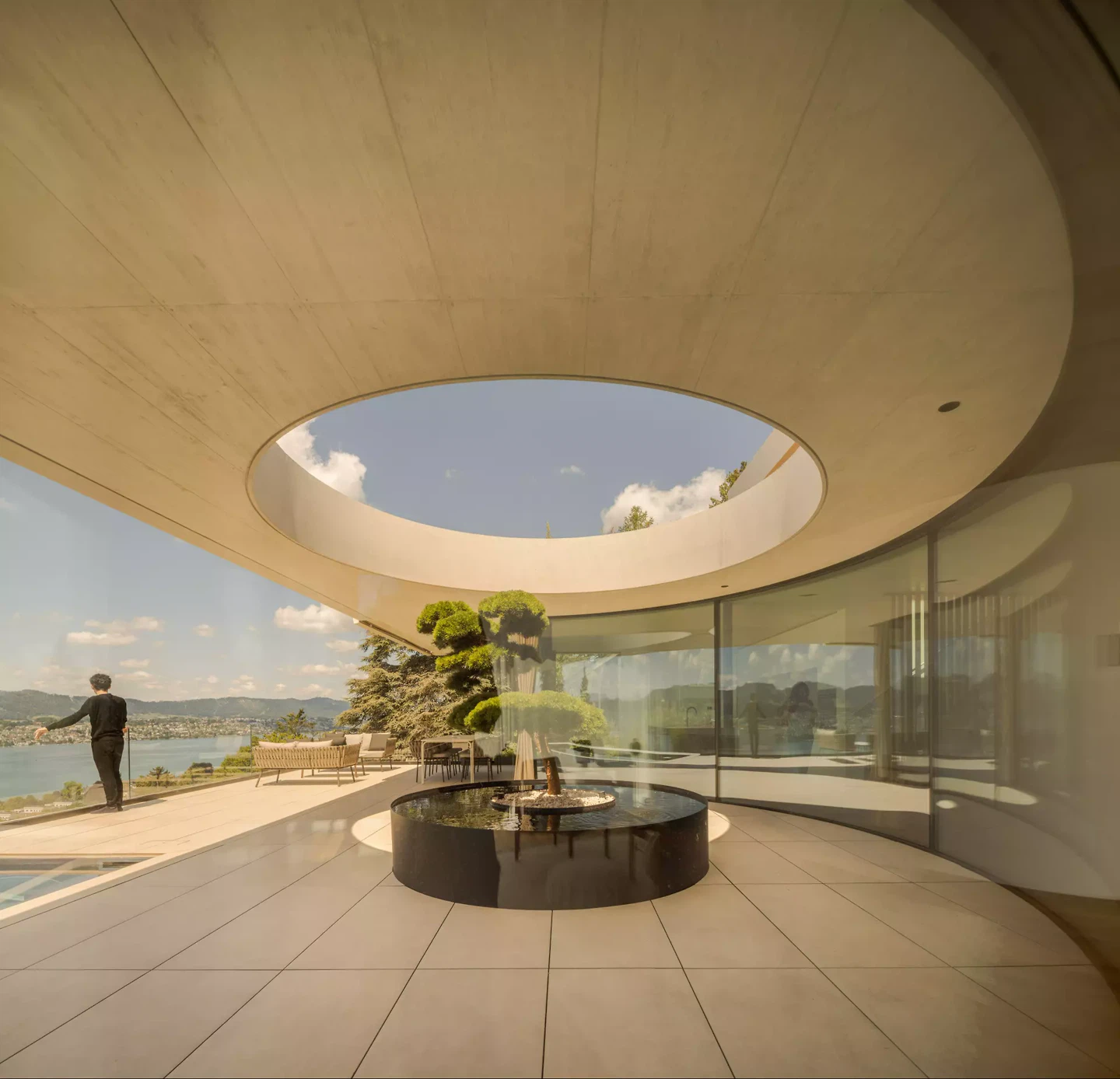 Der Essbereich liegt im Zentrum und steht sowohl in Bezug zum rückwärtigen Landschaftsraum als auch zur Aussicht auf den See. Wohn- und Küchenbereich werden durch einen halbrunden Patio gegliedert, in dessen Mitte ein grosser Baum steht – ein Wunsch der Bauherrschaft. Alle Bereiche gehen fliessend ineinander über, erhalten durch die Zonierung jedoch ihre Eigenständigkeit und bleiben zugleich visuell miteinander verbunden. Durch gebogenes Glas und eine rund ausgeschnittene Deckenplatte wird diese räumliche Kontinuität verstärkt. Im obersten Geschoss befinden sich das Elternschlafzimmer sowie ein grosszügiges Arbeitszimmer, beide zum See orientiert. Auffällig ist das zweigeteilte Bad im Zentrum, das sich sowohl zum Landschaftsraum als auch zur Seesicht öffnet. Der Arbeitsbereich mit integrierter Teeküche öffnet sich zur oberen Terrasse und wird durch ein Atrium in zwei Arbeitsplätze gegliedert. Das ursprüngliche Konzept sah zudem einen Wechsel der konstruktiven Identität vor: ein massiver Betonsockel unten, darüber eine leichte Holzskelettkonstruktion mit aluminiumverkleideten Kuben, deren reflektierende Oberfläche die Grenzen auflöst und die Umgebung einbindet.