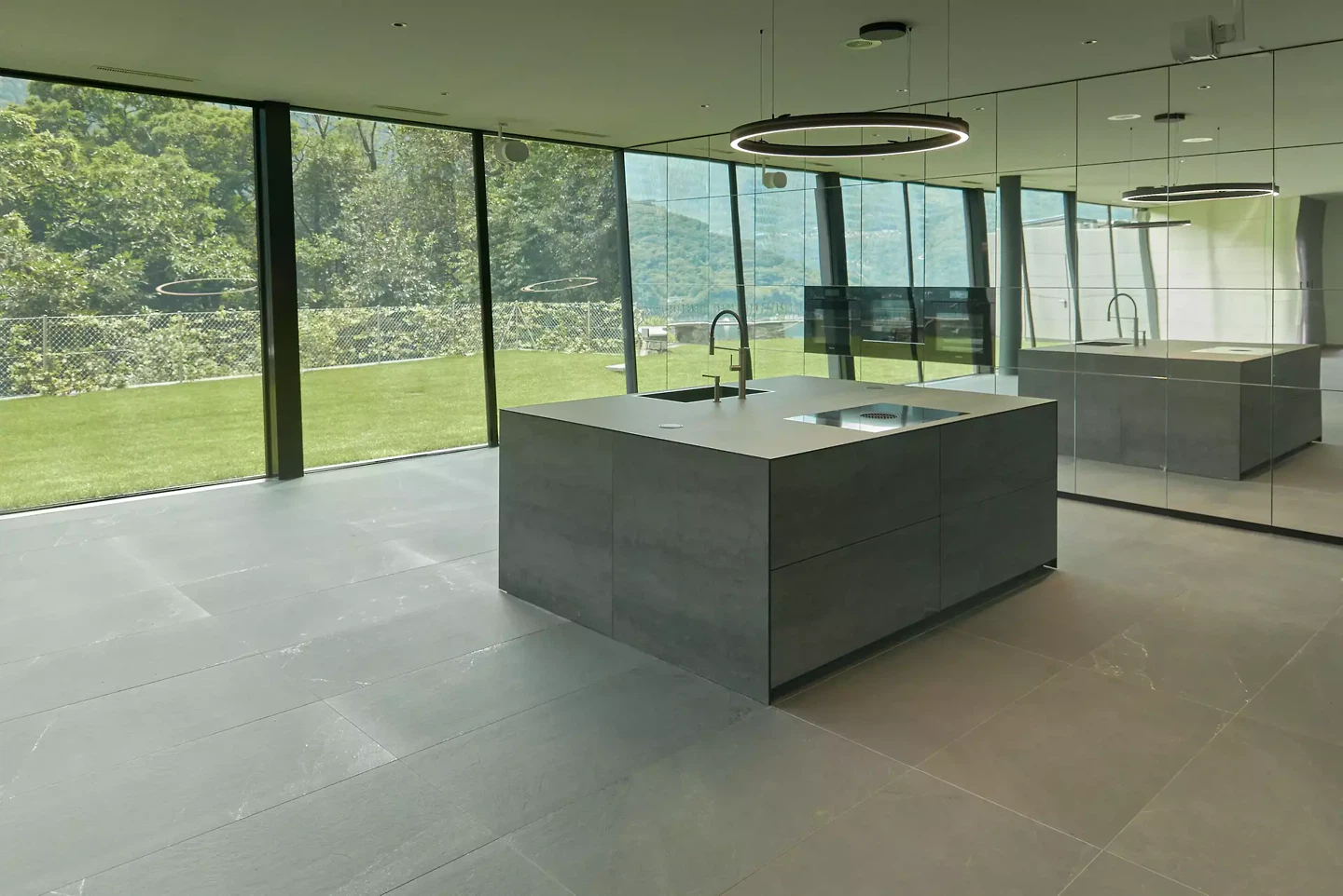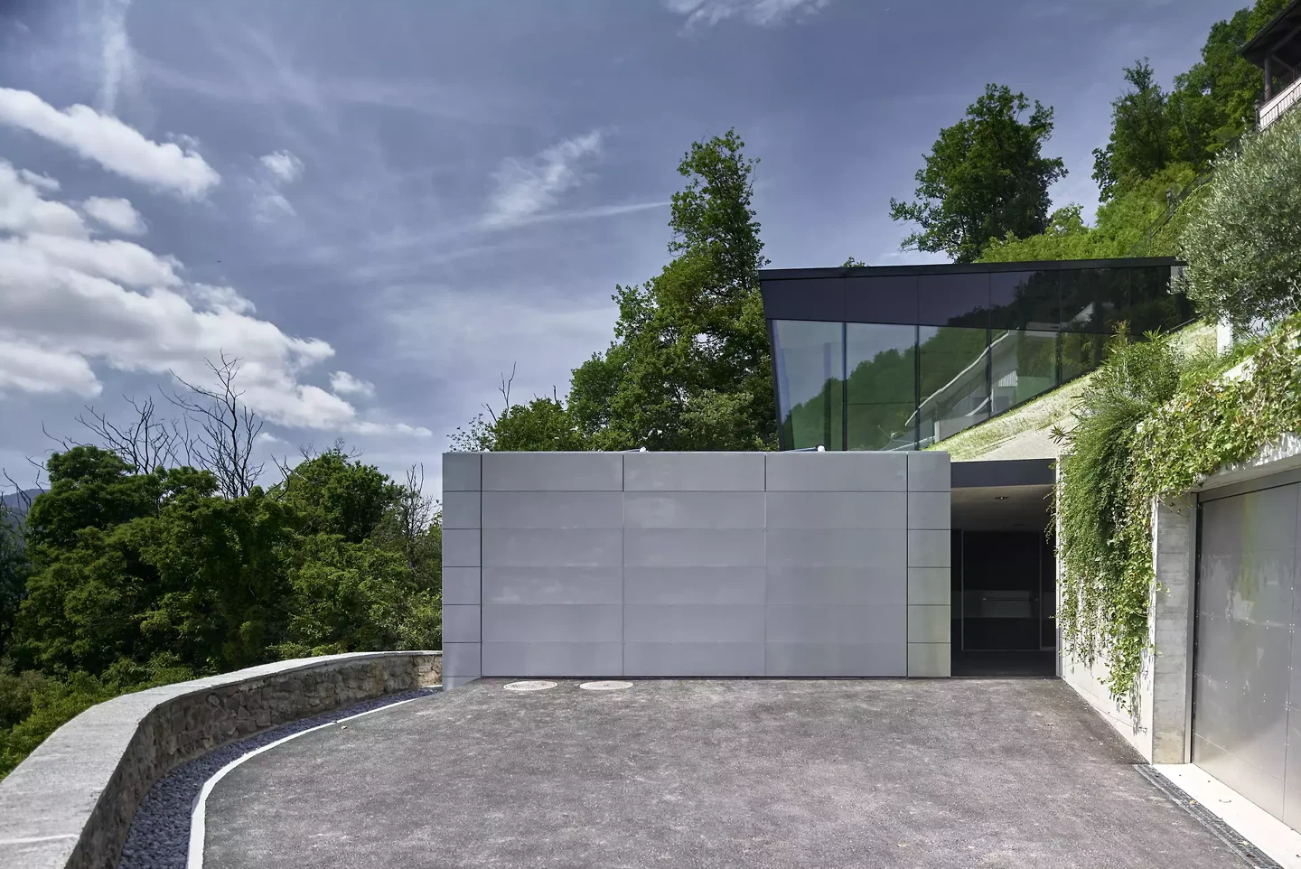 Das Einfamilienhaus erstreckt sich über drei separate Ebenen und nutzt die bergseitige Felsausgrabung, um die nutzbaren Flächen zu maximieren und einen kontinuierlichen Dialog zwischen Innen und Aussen zu schaffen:Der Untergeschoss (Wellnessbereich): beherbergt den Wellness- und Fitnessbereich mit einem Innenpool, einer Sauna und einem Dampfbad.