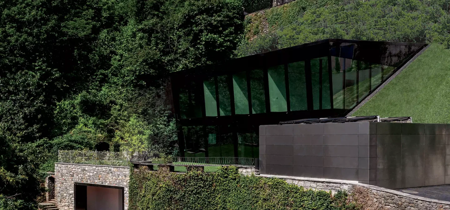 Das Leitkonzept ist die «Landschaftsmimikry». Das Gebäude ist als schwarzer Kristall konzipiert, der in den Felsen eingebettet ist, wobei Fassaden und Dach den Himmel und den Wald reflektieren und den Baukörper fast unsichtbar machen. Diese Idee führt zu einem ständigen Dialog zwischen Innen und Aussen: die Transparenz der Fassaden lässt den Blick durch das Gebäude hindurchgleiten, während die Verwendung von dunklem, halbverspiegeltem Glas und glänzenden schwarzen Photovoltaikmodulen auf dem Dach die Harmonie mit dem Genius Loci gewährleistet und das Erscheinungsbild je nach Wetterbedingungen und Lichteinfall variieren lässt.