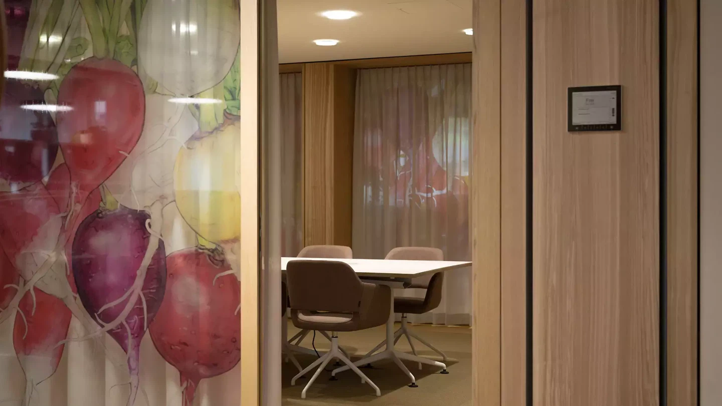 Das Kantonsspital Uri stand vor einer klassischen typologischen Spannung: Zwei Etagen, zwei Kulturen, ein Haus. Im zweiten Obergeschoss die Ärzteschaft und medizinischen Beratungsdienste – unmittelbar, operativ, nah am Betrieb. Im dritten Obergeschoss Direktion, Finanzen, HR und Pflegeleitung – strategisch, administrativ, mit einem anderen Takt. Unter dem Motto «gemeinsam wachsen» wurden diese zwei Stockwerke miteinander verbunden. Die Grundidee folgt einer vertikalen Logik: von unten nach oben, vom operativen Tun zum strategischen Denken. Das «Erdreich» im zweiten Obergeschoss bildet die funktionale Basis, tief verwurzelt in der klinischen Arbeitsrealität. Im dritten Obergeschoss entfaltet sich der Raum in eine «Pflanzenwelt». Die verbindende Wendeltreppe ist hierbei kein reines Erschliessungselement, sondern der räumliche Übergang zwischen zwei Aggregatzuständen derselben Institution. Visuell getragen werden die Räumlichkeiten durch die geschossübergreifende Illustration von Eva Kläui: Sie bricht die vertikale Trennung kunstvoll auf und verwebt die beiden funktional getrennten Welten zu einem atmosphärischen Ganzen.