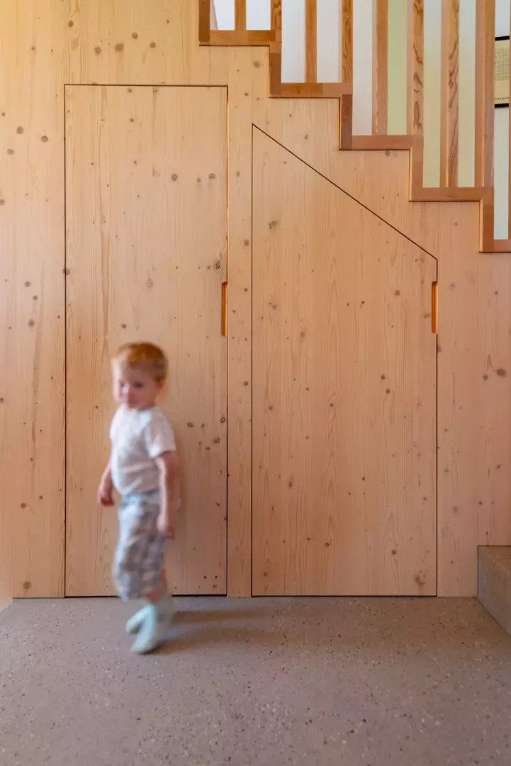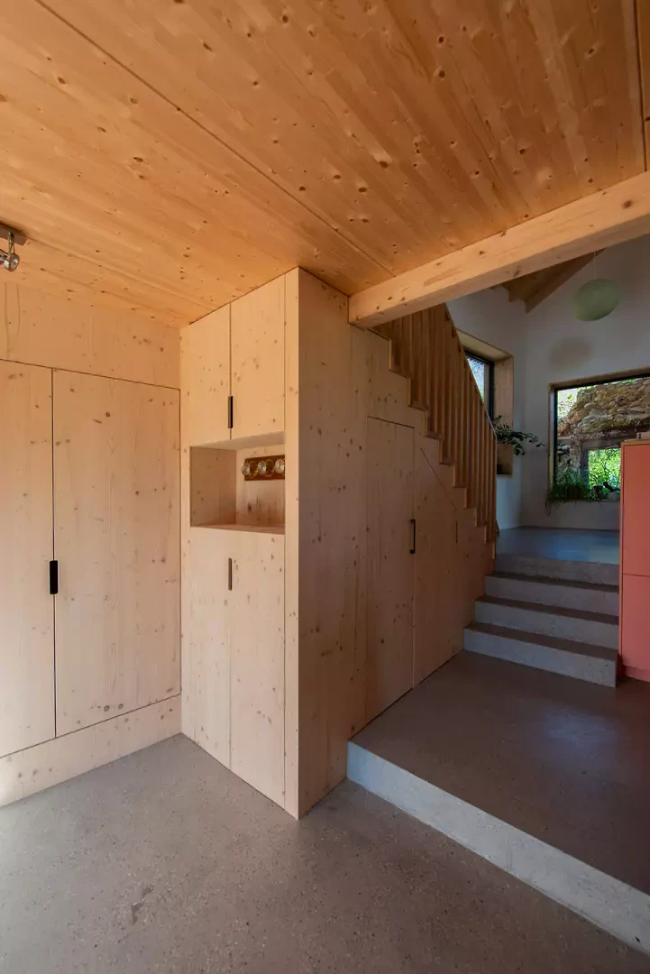 Das Ensemble gliedert sich in eine klare räumliche Struktur: ein «Nacht-Haus» und ein «Tag-Haus», während die ehemalige Scheune zu einem Atelier umgebaut wurde. Jede Einheit hat ihren eigenen Charakter und ihre Funktion. Die Fassaden unterscheiden sich in ihrer Materialität: Kalk für das «Nacht-Haus», Holz für das «Tag-Haus» und Stein für das Atelier. Das ehemalige Dorfhaus beherbergt Schlafzimmer und Sanitärräume, wobei sein baulicher Charakter mit kleinen Räumen erhalten bleibt – diese lassen sich dank grosser Schiebetüren flexibel erweitern. Der neue Baukörper bildet das Zentrum des Wohnens und Familienlebens. Der Raum folgt der natürlichen Hangneigung und arbeitet mit unterschiedlichen Ebenen, um Bereiche wie Küche, Ess- und Wohnzimmer zu zonieren.