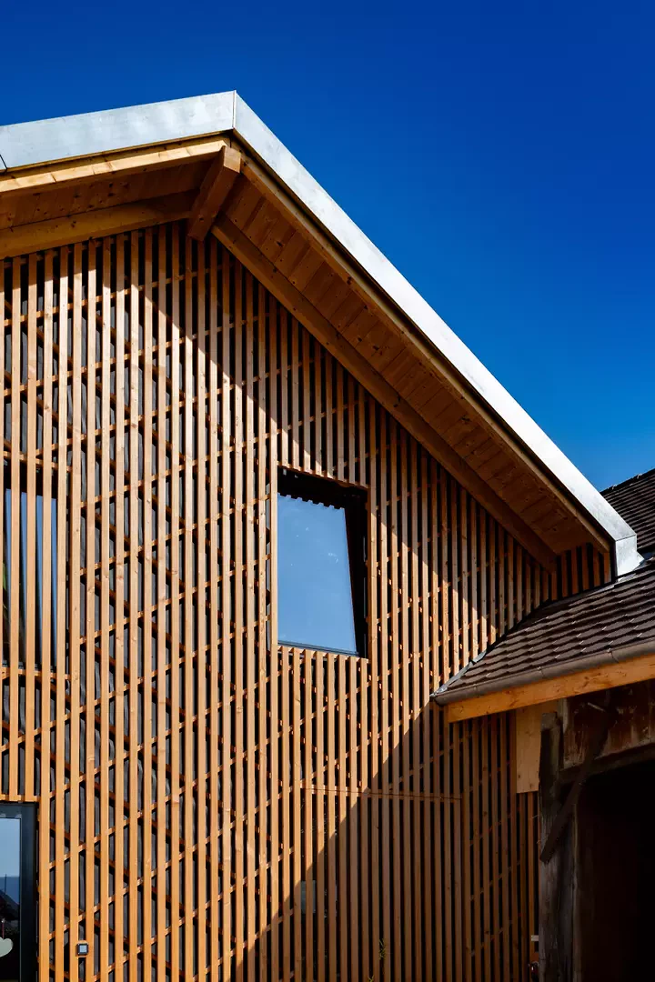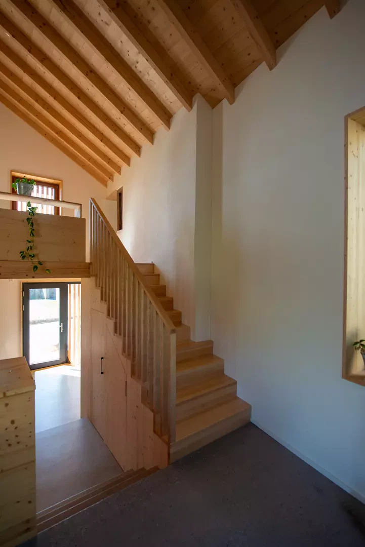Die Holzrahmenkonstruktion des Neubaus sowie die Sanierung der bestehenden Dachstühle sind Teil eines ganzheitlichen ökologischen Ansatzes. Dieser umfasst natürliche, leistungsfähige Dämmstoffe, eine Wärmepumpe, Photovoltaikmodule und eine Regenwasserzisterne. Der architektonische Eingriff wertet den Bestand auf nachhaltige Weise auf, tritt in Dialog mit der Geschichte des Ortes und schafft zugleich eine zeitgemässe Räumlichkeit, die sowohl den Austausch als auch das Bedürfnis nach Privatsphäre unterstützt.