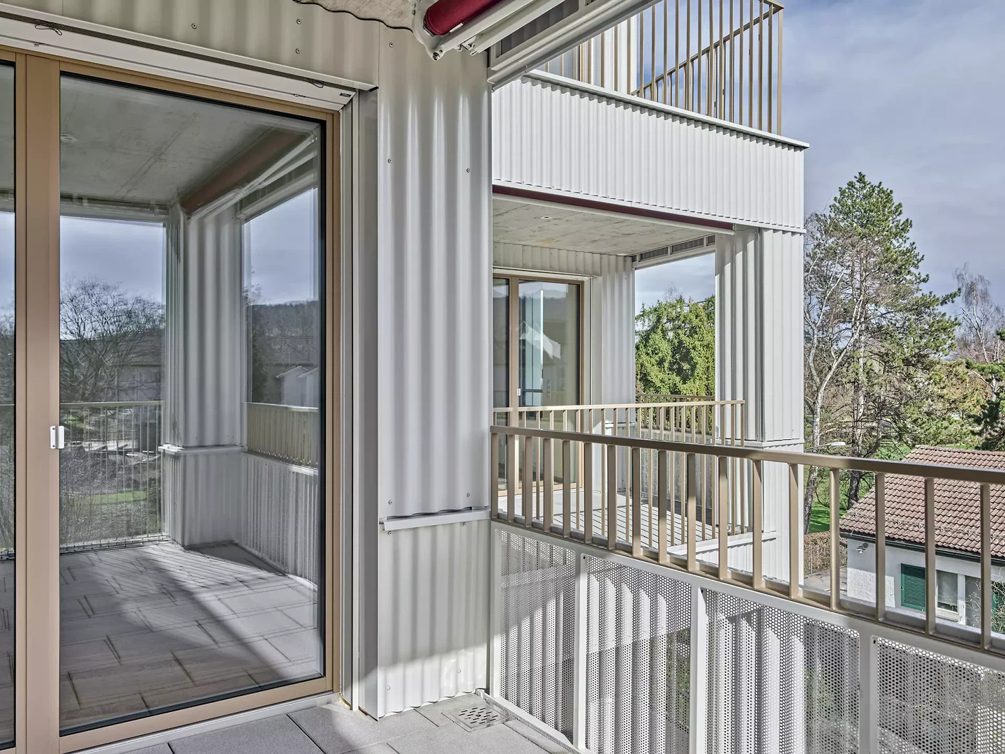 Unweit der ikonischen Badi Allenmoos fällt ein neuer Baukörper auf – und zwar immer wieder anders. Das liegt nicht nur daran, dass er statt des üblichen Putzes ein feines Metallkleid trägt. Er verhält sich auch typologisch changierend: eine einseitig gezackte Zeile, die sich an der Kreuzung als Kopfbau präsentiert. Er macht den Auftakt zu einer Perlenkette von Bauten jüngerer Zeit, die der geschwungenen Grabenwies folgen. Auch wenn sich diese baulich von den frontal auftreffenden 1940er-Zeilenbau-Anrainern abheben, referenzieren sie deren poröse Gartenstadtstruktur. Nach Süden hin profitiert der Neuzugang von gut besonnten Blicken auf ein riesiges Familiengarten-Idyll.