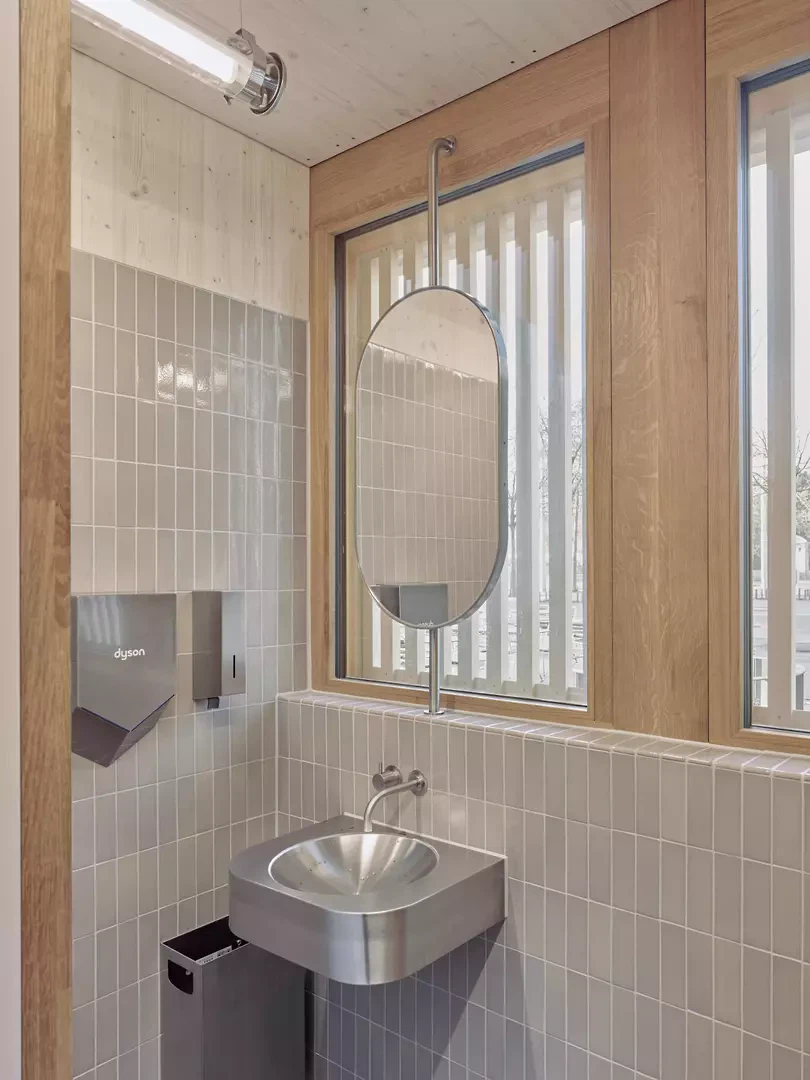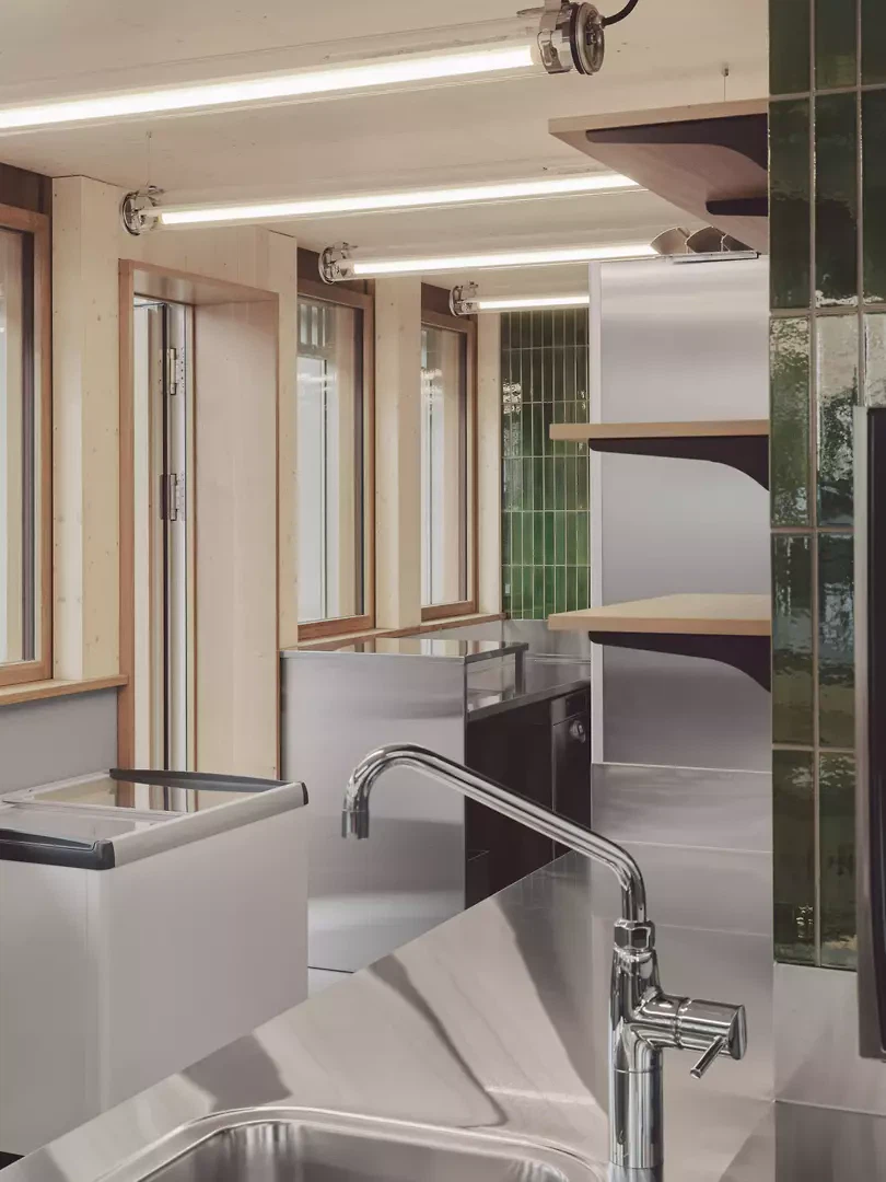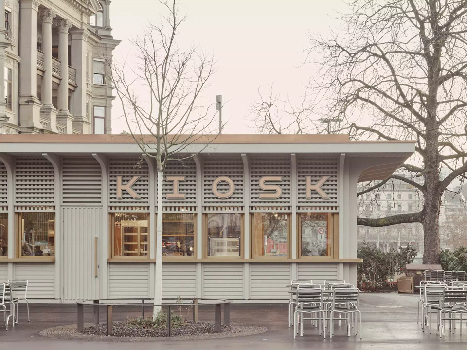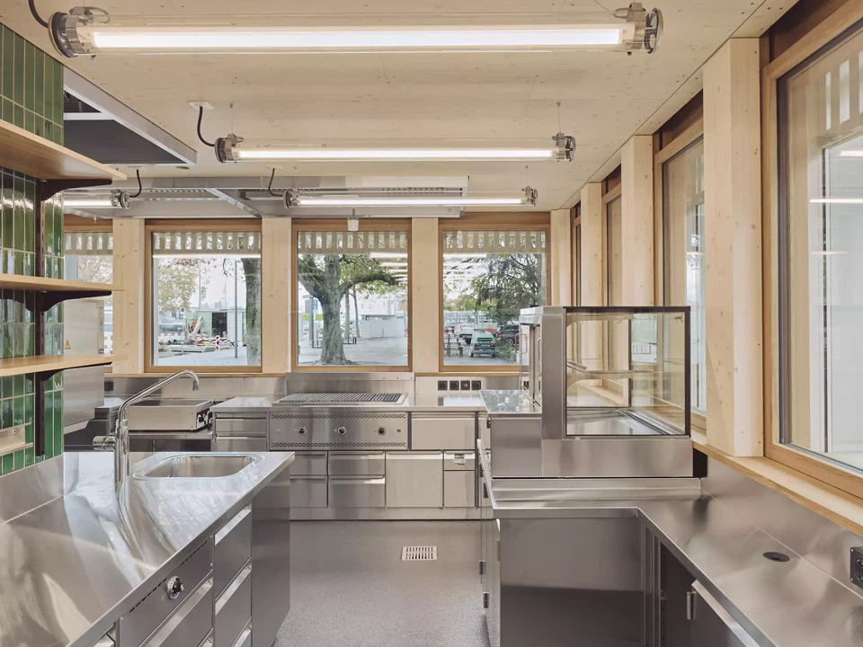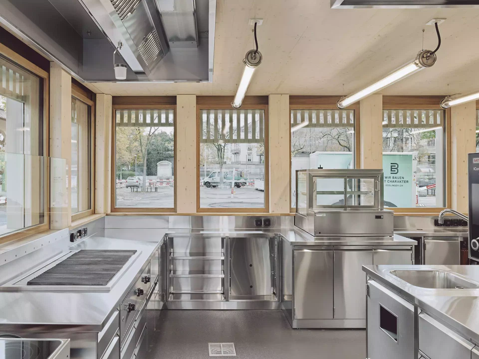 Der Gastronomiebereich orientiert sich nach Südwesten zur Stadthausanlage und zum See. Die dreiseitige Öffnung verankert den Kiosk im Parkraum, erhöht seine Visibilität und stärkt den öffentlichen Charakter des Gebäudes. Küche, Ausgabebuffet und Aussensitzplätze stehen in unmittelbarem räumlichem und visuellem Zusammenhang, sodass sich der Betrieb nahtlos in den Aussenraum fortsetzt. Die Anlieferung erfolgt von der Fraumünsterstrasse und ist konsequent vom Gästebereich getrennt.