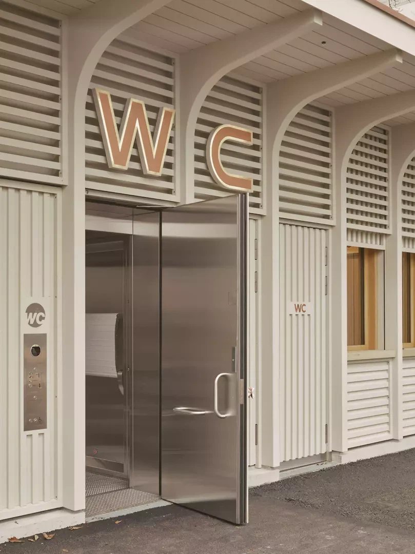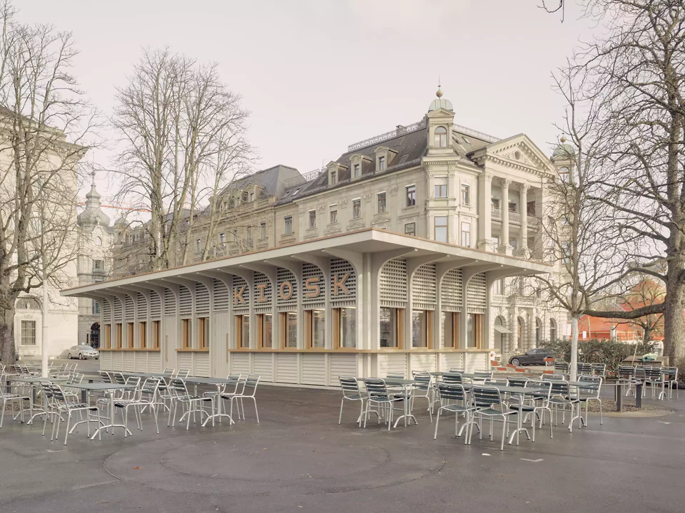 Entlang der Peripherie sind verschiedene Kleinbauten angeordnet – darunter Toilettenanlagen, eine Bushaltestelle und der bestehende Kiosk – die bewusst ausserhalb der strengen Symmetrie platziert sind. Der neue Kiosk reiht sich selbstverständlich in diese Abfolge peripherer Kleinbauten ein.