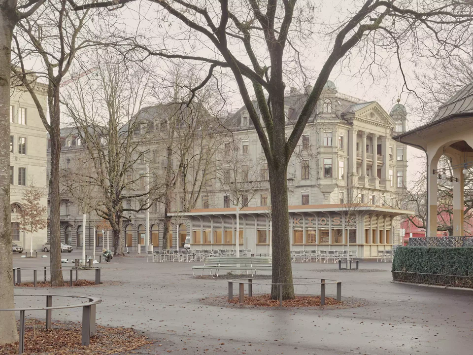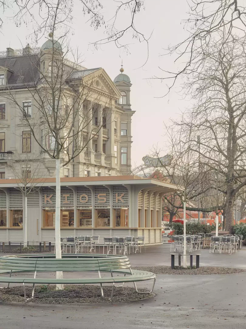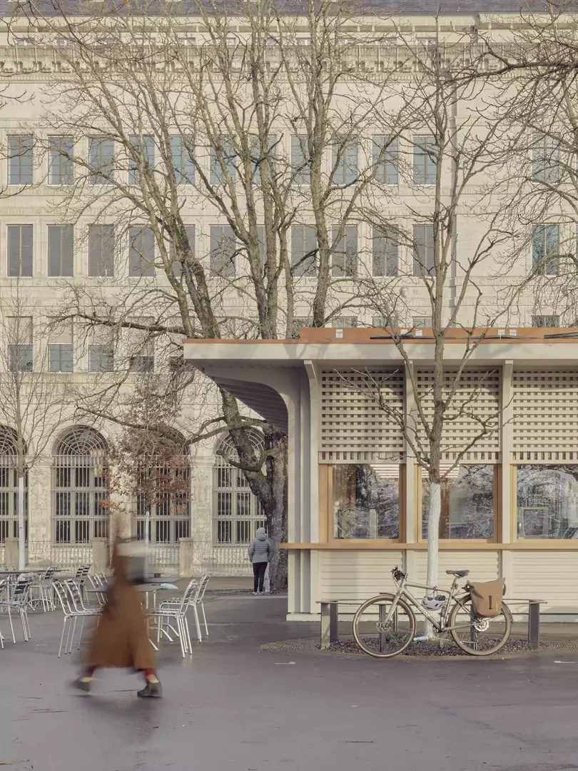 Die Volumetrie des Neubaus zeigt sich als kompakter, eingeschossiger Baukörper. Das längliche Volumen ist parallel zur Fraumünsterstrasse entlang der östlichen Perimetergrenze positioniert. Die Setzung nimmt sowohl auf das bestehende wie auch auf das weiterentwickelte Bepflanzungskonzept Rücksicht und ermöglicht eine ruhige Integration in die Gesamtanlage. Gleichzeitig entsteht ein angemessener Abstand zum Maillard-Pavillon sowie eine ausgewogene Dichteverteilung innerhalb des Parks. Der neue Kiosk stärkt die Aufenthaltsqualität des Ortes, ohne die diagonalen Fussgängerbeziehungen zu beeinträchtigen.
