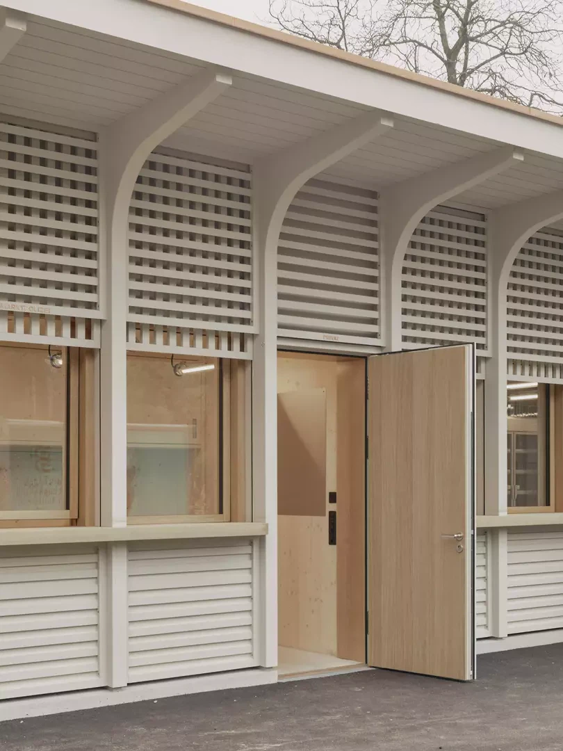 Der Ersatzneubau des Kiosks ist als kompakter, eingeschossiger Holzbau mit Untergeschoss konzipiert. Die Konstruktion folgt einer klaren, materialgerechten Logik und leitet den architektonischen Ausdruck unmittelbar aus dem Tragwerk ab.