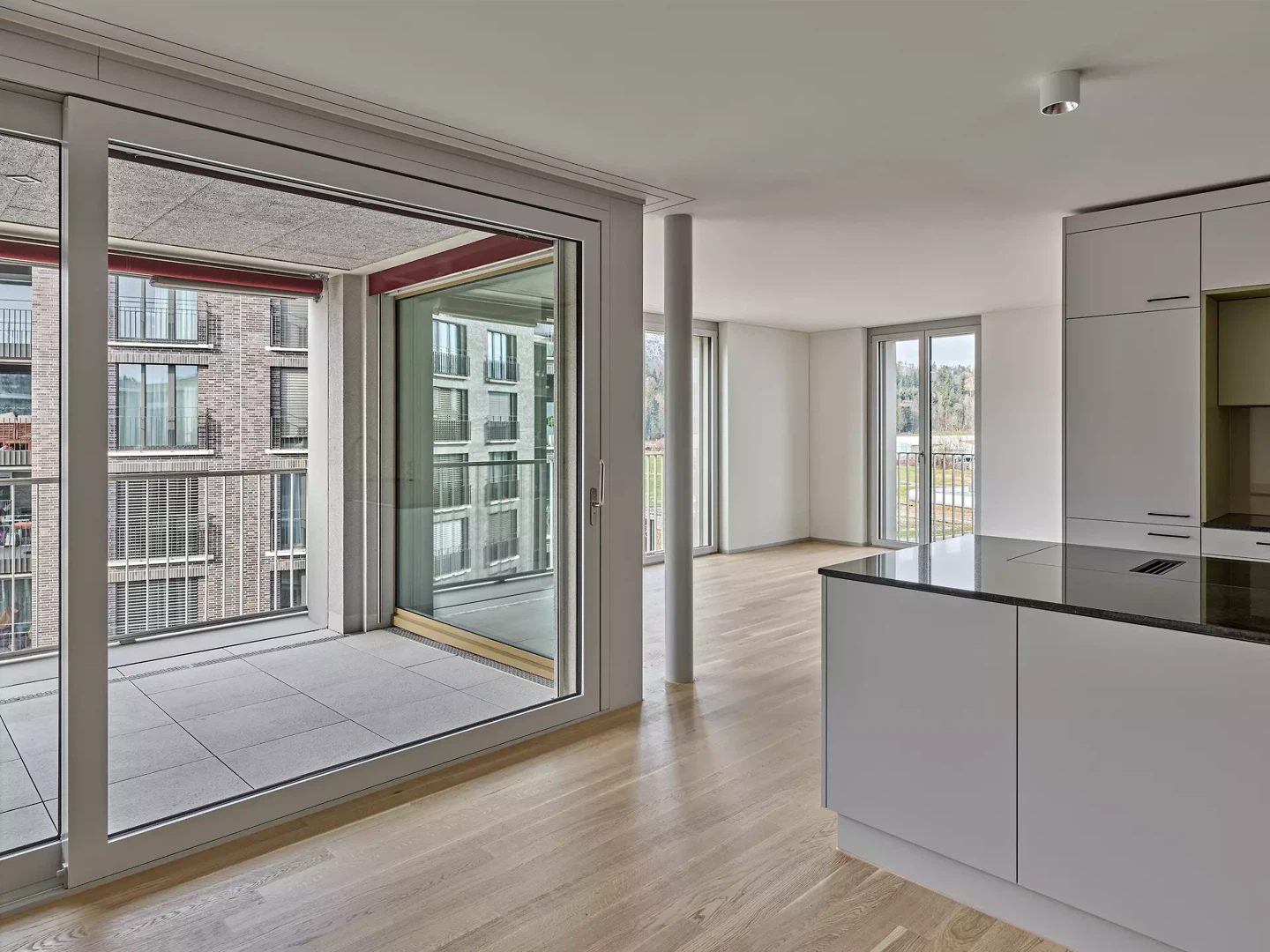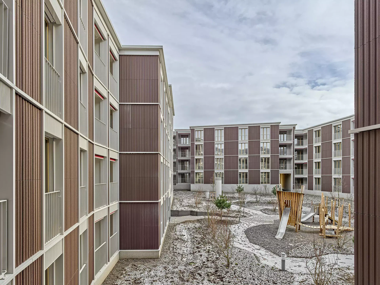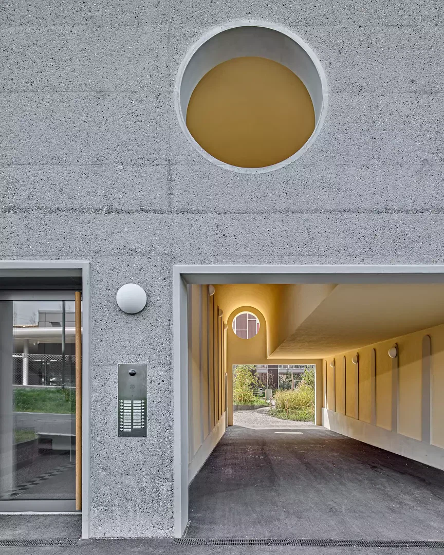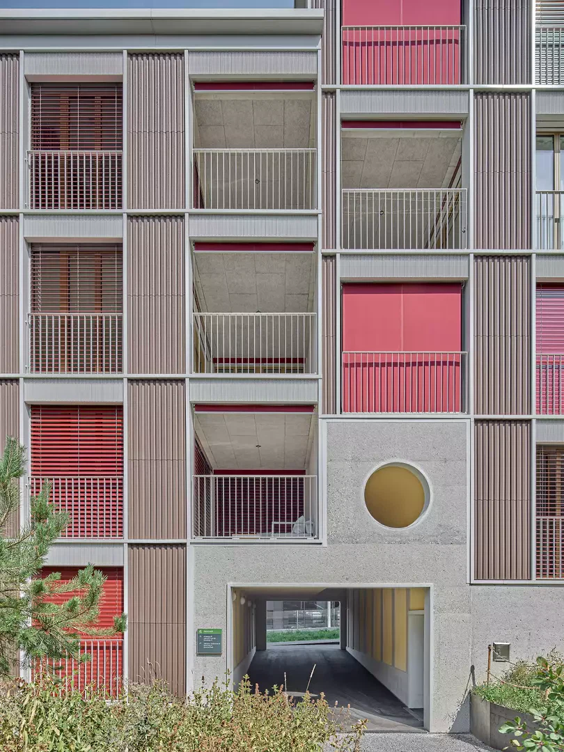 Im Hof verweisen Rahmung und Betonung jeder Wohnung nicht nur auf deren Vielfalt, sondern unterstreichen den feingliedrigen Massstab und damit das Bild einer offenherzigen, durch den individuellen Gebrauch geprägten Gartenfassade. Unterstützt von schallbrechenden, fein profilierten Tonplatten, die als vertikale Ausfachungen mit tiefen Loggien alternieren, entsteht so ein wohnliches Ambiente, das die gemeinsame grüne Mitte rahmt. Am Moosweg macht ein hallenartiger Hofzugang eine einladende Geste und wird gleichsam zum Anlass für eine typlogischen Variation, die das Lärmproblem im Norden entschärft.