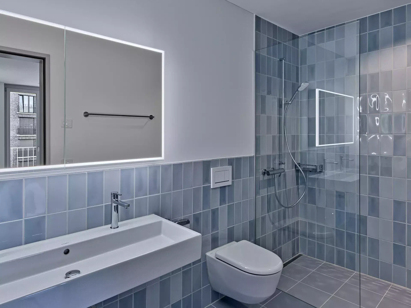 Ersteres bedingte eine überlegte Platzierung der Treppenhäuser, um alle Wohnungen paritätisch an der Gebäudehöhe teilhaben zu lassen. Entsprechend sind die Kerne so angesiedelt, dass die Gebäudeteile mit Höhenversatz auf die Topografie reagieren. Von aussen ist dies nur als sanft ansteigende Silhouette sichtbar. Indes unterstreicht die kulissenhafte Überhöhung die Leitidee, der Öffentlichkeit ein städtisches Gesicht – eine Fassade eben – zu zeigen. Ebenso ist sie akustischer Natur, um einen möglichst ruhigen Hof zu schaffen. Während also das Aussen dank liegender Ziegel sowie akzentuierten Öffnungen das Bild einer in sich ruhenden Kulisse vermittelt und der Sockel das Aufeinandertreffen von Haus und Terrain nachzeichnet, thematisiert das Innere den menschlichen Massstab.