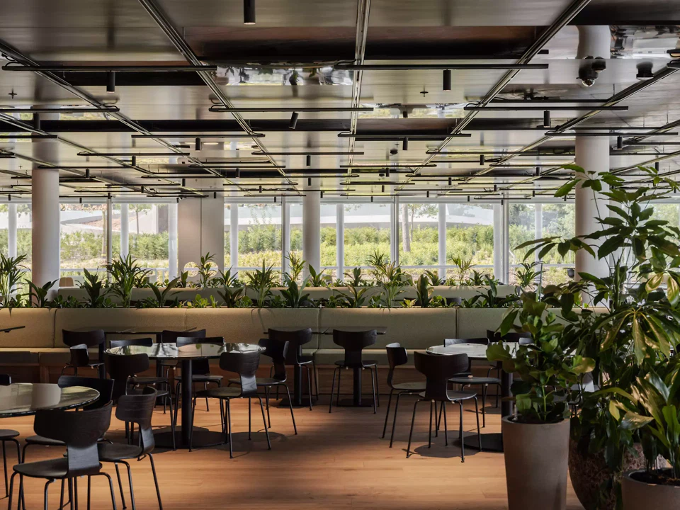 Ein Fitnessbereich, der Yoga-Kurse und Trainingseinheiten anbietet, steht den Mitarbeiterinnen während der Pausen, vor oder nach der Arbeit zur Verfügung. Die Mitarbeiterinnen können zwischen mehreren Verpflegungsoptionen wählen, darunter ein Bistro in der Nähe des Eingangs, ein Restaurant im ersten Stock und eine Cafeteria mit grosser Terrasse im sechsten Stock. Coffee-Points in den Espaces Collaboratifs dienen als praktische Erfrischungspunkte. Die Mahlzeiten werden in zwei Küchen von Fachleuten zubereitet, die ebenfalls den Blick auf den See geniessen – eine unerwartete Qualität für einen funktionalen Raum, der oft im Hintergrund liegt.