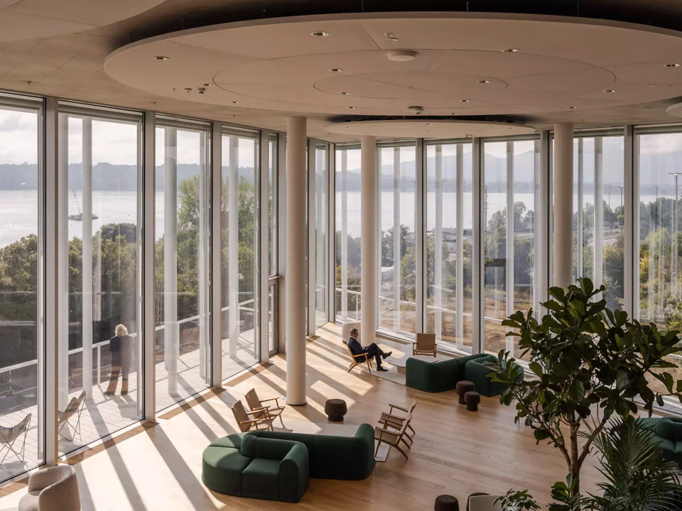 Die verschiedenen Arbeitsbereiche bieten sowohl Zonen, die die Konzentration fördern, als auch Räume, die der Zusammenarbeit und dem Austausch gewidmet sind. Zwei doppelhohe Räume, sogenannte Espaces Collaboratifs, und das Restaurant öffnen sich zum See und bieten allen freie Sicht für Besprechungen, Arbeit oder einfach, um die Landschaft zu geniessen. Diese offenen Räume wechseln sich mit den für Kund*innen reservierten Bereichen ab, die ebenfalls einen atemberaubenden Blick auf den See bieten.