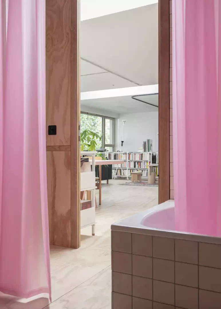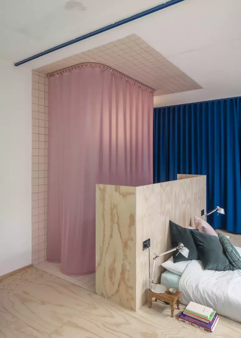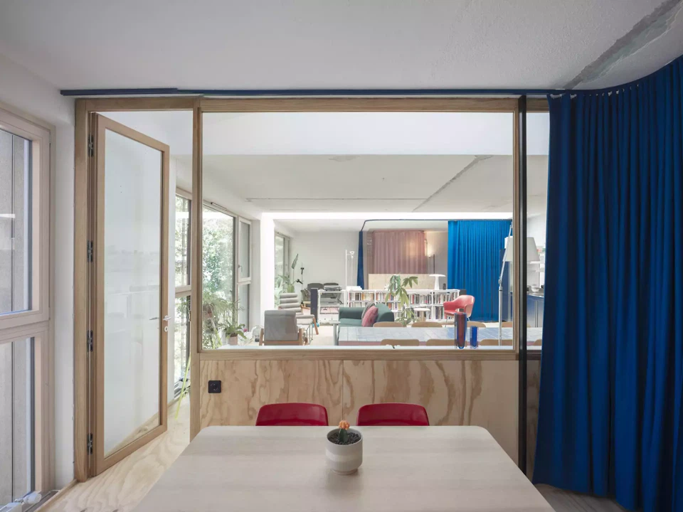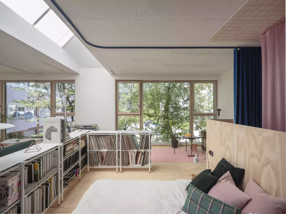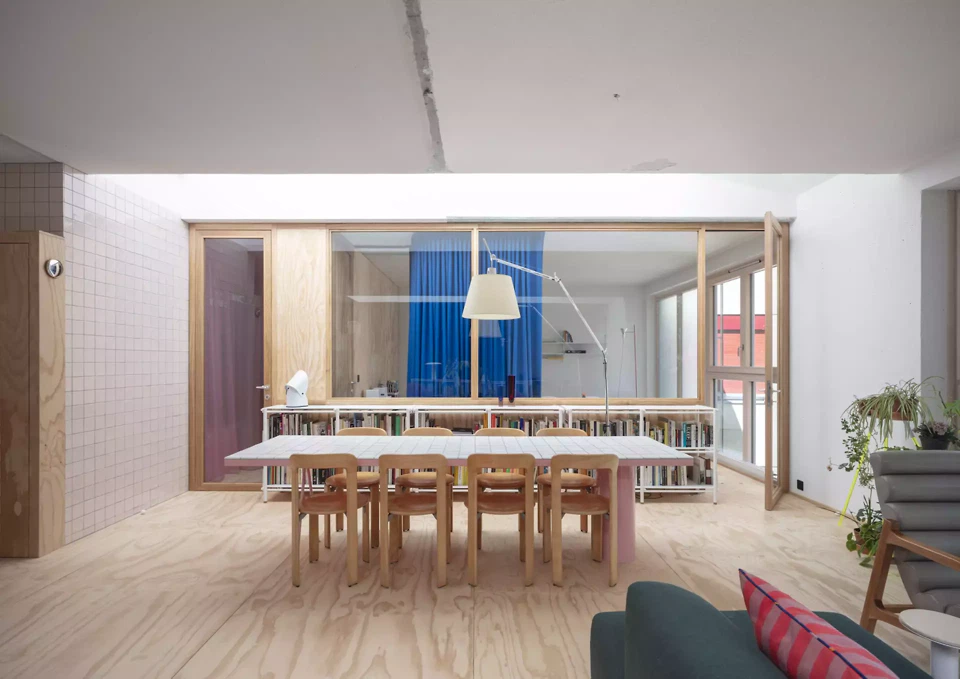 Die Umnutzung einer ehemaligen Zahnarztpraxis zu Wohnzwecken entspricht Daniel und Galliane Zamarbides und Carine Pimentas Versuch, bestehende Architektur lebendig zu erhalten und die räumliche Entwicklung dem Wandel der Zeit anzupassen. Das kleine Gebäude in Genf wurde Anfang der 1980er-Jahre für eine Mischnutzung als Künstleratelier, Gewerbe- und Wohnraum konzipiert. Die Räume sind durch zwei querliegende Oberlichter belichtet. Der Grundgedanke der Offenheit wird durch den Verzicht auf typische Begrenzungselemente deutlich. Die notwendigen Raumgrenzen sind nicht etwa durch Trennwände, sondern durch Vorhänge und Glasflächen organisiert. Durch die frei wählbare Position der Textilien und Möbel entstehen unterschiedliche Lichtsituationen. Möbel, Objekte, Teppiche und Einbauten erscheinen beinahe lebendig, ähnlich den Akteuren auf einer Theaterbühne.
