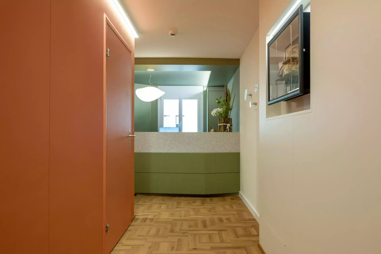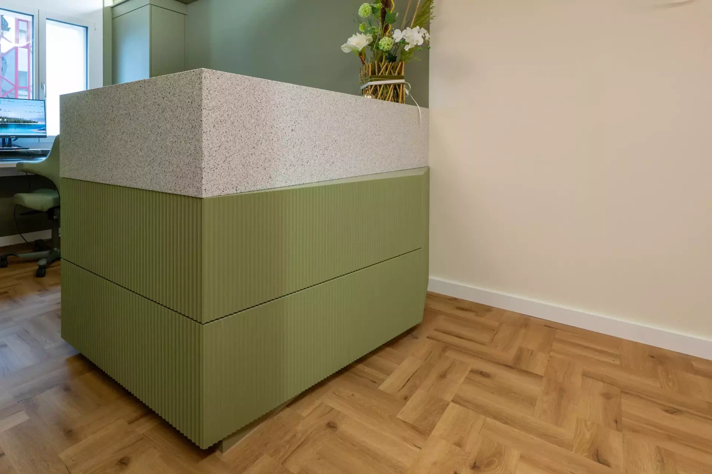 Medizintechnik, Stauraum und Arbeitsabläufe wurden vollständig in die Innenarchitektur integriert. Geräte verschwinden in massgefertigten Einbauten, Arbeitsflächen sind ergonomisch optimiert, die Wegeführung ist klar und effizient. Gleichzeitig bleibt die Atmosphäre ruhig und wohnlich. Die Praxis wirkt nicht klinisch, sondern menschlich. Diese Balance zwischen technischer Präzision und emotionaler Raumqualität war ein zentrales Ziel des Projekts.