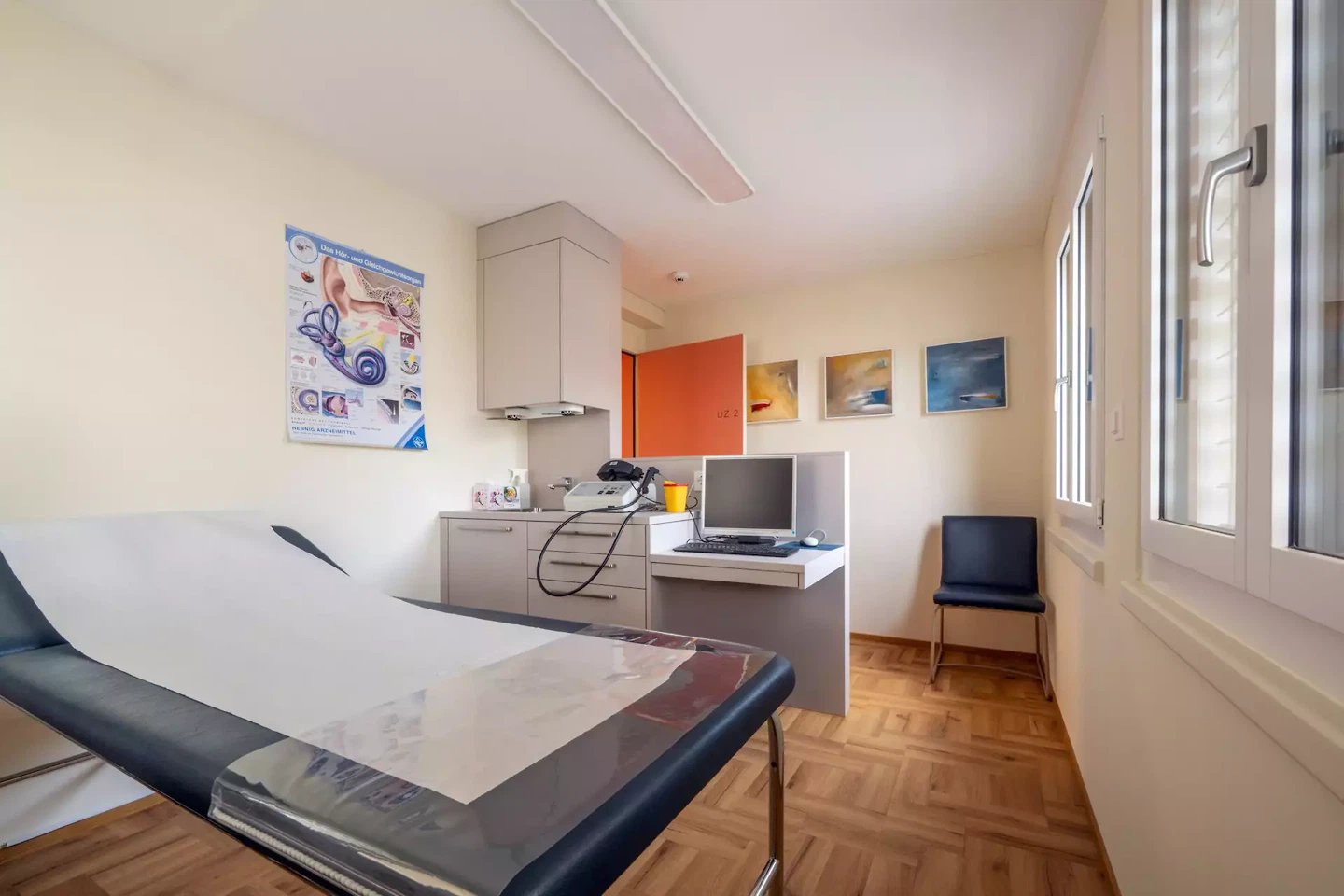 Empfangsbereich mit Warten Korridor mit Sicht zum Empfang Empfang EmpfangKontrsuktions- und Materialdetail Empfangsraum gezielt eingerahmt in Farbe Garderobendetail Untersuchungszimmer mit HNO Einheit auf kleinstem Raum Untersuchungszimmer Arbeitsplatz Ärztin auf kleinstem Raum Korridorbereich als Erschliessungszone für IV-WC und Untersuchungsräume Wartebereich hinter Verglasung Wartebereich mit neuem Brandschutzverkleidetem Stahlunterzug Patienten und IV-WC Audiokabine der höchsten Nutzungsklasse als eiegenständiger Raum im Raum eingebaut Untersuchungszimmer für diverse Untersuchungen in einer Hals- Nasen und Ohrenarztpraxis Personalraum mit Personalküche. Mut zur Farbe
