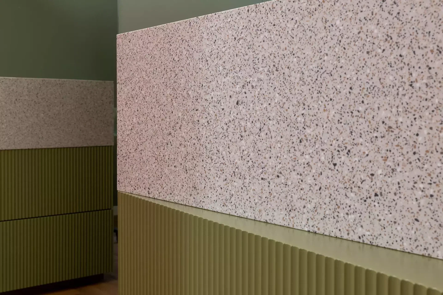 Die Materialwahl folgt klaren Kriterien: robust, hygienisch, langlebig, ruhig. Matte Oberflächen reduzieren visuelle Unruhe. Einbauten sind präzise gefügt. Der warme Holzfussboden schafft einen atmosphärischen Gegenpol zur Medizintechnik. Die Gestaltung vermeidet modische Effekte und setzt auf zeitlose Ruhe.