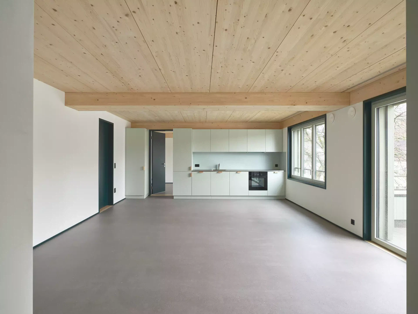 Jede Wohnung hat jeweils nebst einem gemeinsamen Bad oder einer Dusche ein Schlafzimmer mit einem speziell zugeordneten Badezimmer. Aus dem Untergeschoss zieht sich konstruktiv der massive, aussteifende Treppenhauskern bis unter das Dach. Im Hochparterre wechselt die massive Konstruktion in Holzelementbauweise. Holzbalken in einem rigiden Schottenraster spannen Sichtholzdecken auf. Die Kombination aus Sichtholzdecken, Holzbalken und fugenlosem Gussboden verleiht den Wohnungen einen individuell rohen Charakter und unterstreicht das flexible Wohnen. Der Holzbau manifestiert sich nach aussen hin in der vorgehängten Holzfassade aus vertikalen sägerohen Schalungsbrettern. Der Aussenraum ist quartiertypisch begrünt und erschlossen und zeigt im Zusammenspiel mit der Gebäudevolumetrie prototypisch die Quartierentwicklung einer Aufzonung der Regelbauweise und den Umgang mit Ersatzneubauten.