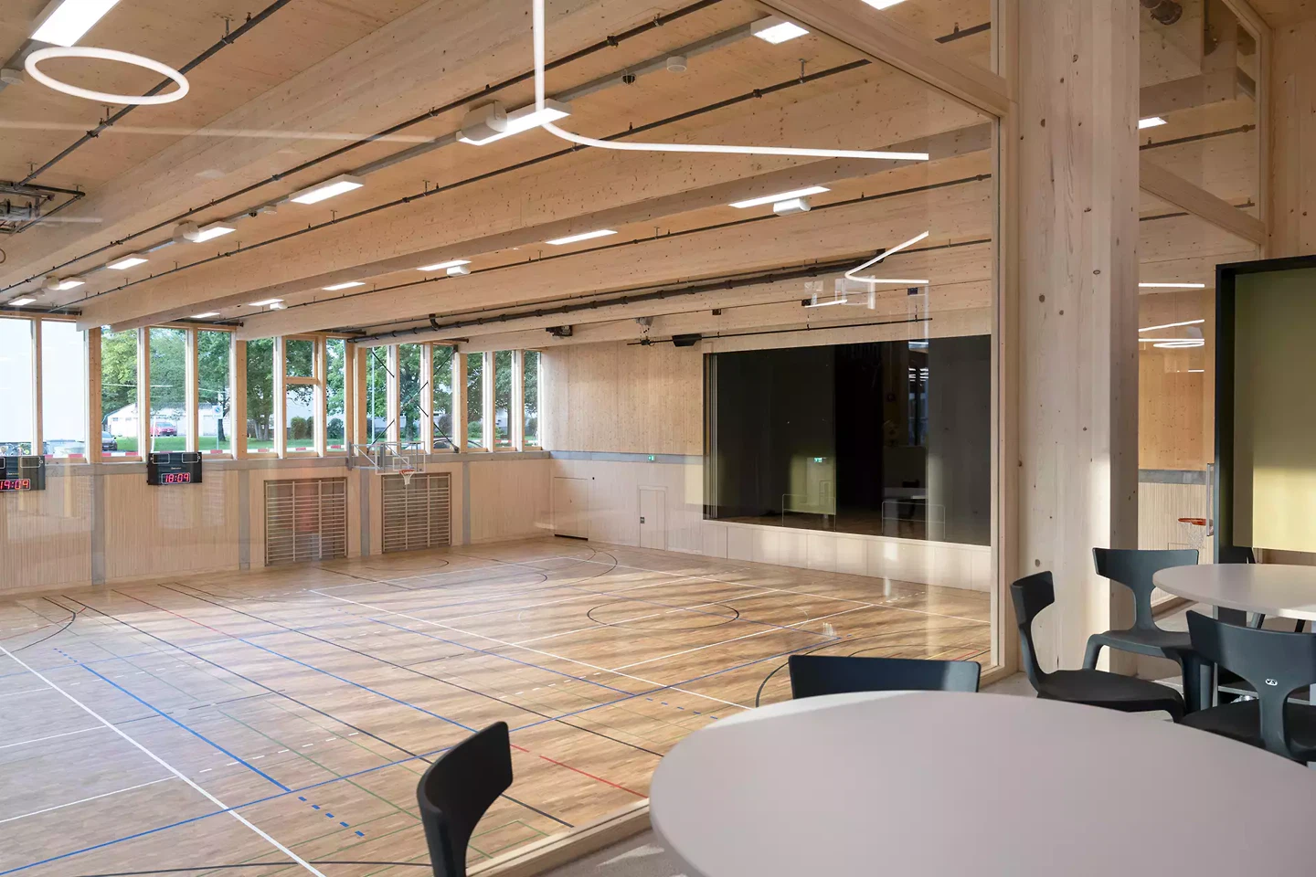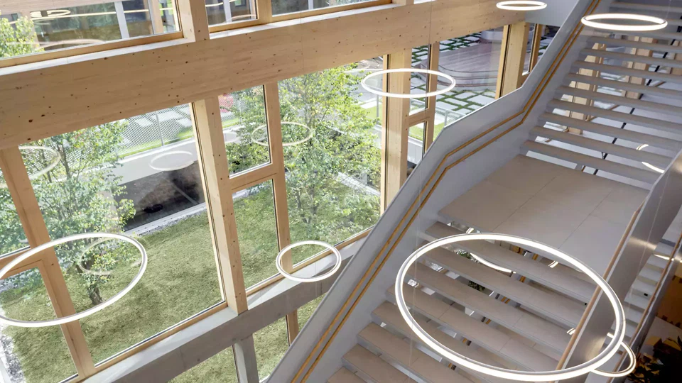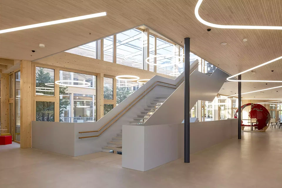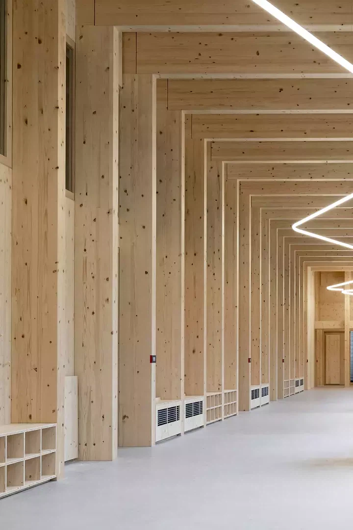 Mit der International School Rheintal entstand ein Schulcampus, der Lernen nicht nur aufnimmt, sondern räumlich ermöglicht. Der Neubau versteht Schule als offenes Gefüge aus Unterricht, Begegnung, Bewegung und informellem Lernen. Altersgerechte Cluster vom Kindergarten bis zur Matura, grosszügige Umgangszonen, Galerien und vier Höfe schaffen eine Umgebung, die Orientierung gibt, Gemeinschaft fördert und zugleich unterschiedliche Atmosphären für Konzentration, Austausch und Rückzug anbietet. Die architektonische Setzung reagiert präzise auf Ort und Aufgabe. Als horizontal gegliederter Baukörper fügt sich das Gebäude selbstverständlich in die Umgebung ein und übersetzt ein komplexes Raumprogramm in einen menschlichen Massstab. Innenhöfe, Sichtbezüge und die zentrale Erschliessung strukturieren das Haus und bringen Tageslicht tief in das Gebäude. So entsteht ein Lernort, der grosszügig wirkt, ohne monumental zu sein, und offen ist, ohne an Klarheit zu verlieren. Konstruktiv ist die ISR als robuster, flexibler Holzbau gedacht. Die sichtbare Tragstruktur, das klare Raster und die natürliche Materialität prägen nicht nur den Ausdruck des Hauses, sondern auch seine Atmosphäre. Holz wird hier nicht als Zeichen eingesetzt, sondern als tragendes Prinzip: konstruktiv sinnvoll, ökologisch wirksam und räumlich identitätsstiftend. Das Gebäude vermittelt seinen Nutzer*innen und Nutzern Wärme, Ruhe und Zugehörigkeit.