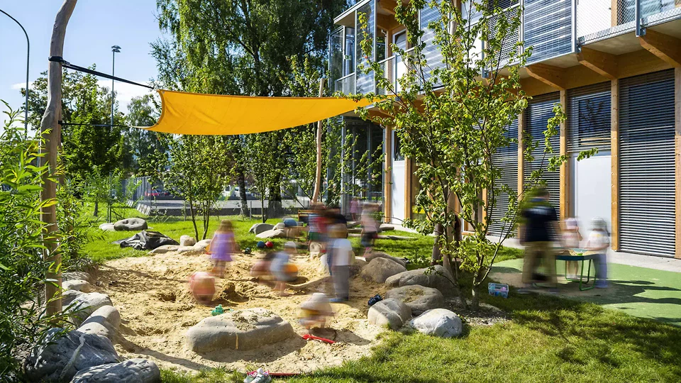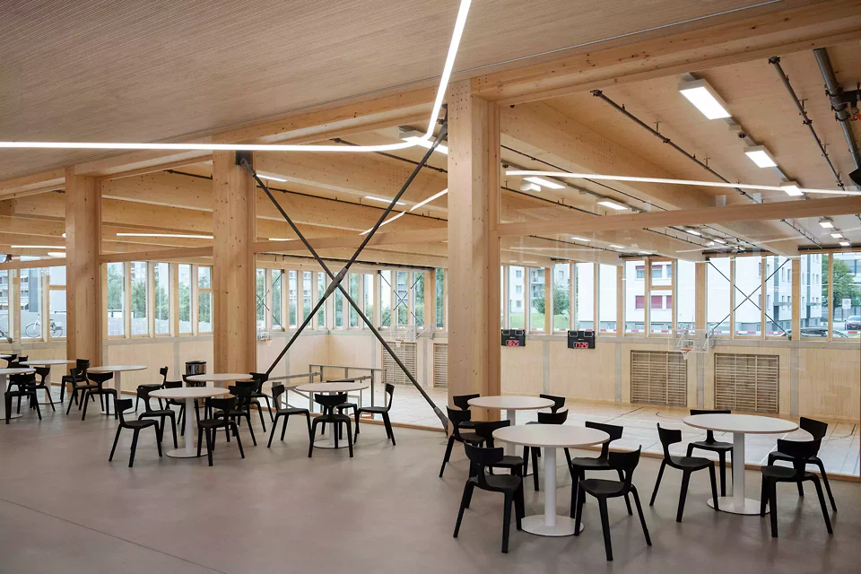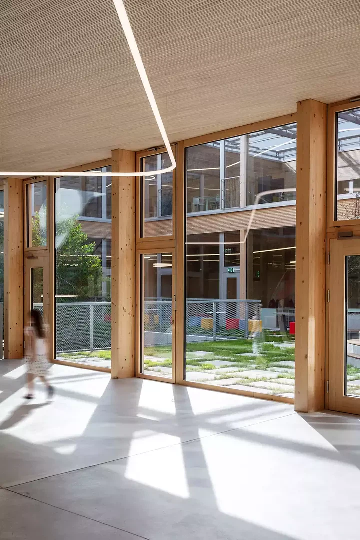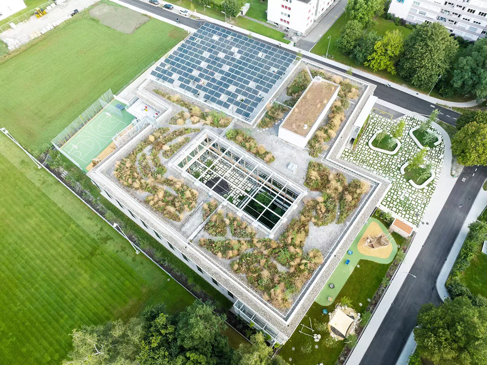 Das Besondere an der Bauaufgabe war, einen Schulbau für sehr unterschiedliche Altersstufen zu entwickeln, der sowohl Orientierung als auch Offenheit bietet. Anstelle eines rein funktionalen Unterrichtsgebäudes entstand eine Lernlandschaft, in der Cluster, Höfe, Galerien und Aussenräume unterschiedliche Formen des Lernens und Zusammenlebens ermöglichen. Die Architektur versteht sich damit als aktiver Teil des pädagogischen Konzepts. Die Entwurfsidee wurde stark vom Standort geprägt. Der hohe Grundwasserspiegel führte zu einer flächigen, niedrig gehaltenen Setzung; die Nachbarschaft aus Wohnzone, Schule und Hochschule verlangte nach einem Baukörper, der gross genug für ein komplexes Raumprogramm ist, sich aber dennoch selbstverständlich in den Ort einfügt. Daraus entstand die horizontale Figur mit klar gegliederten Höfen und einem äusseren Hallentragwerk, das zusätzliche Nutzungen auf dem Dach ermöglicht. Bauherrschaft, Schule und Fachplaner*innenhaben das Projekt im integralen Dialog mitgeprägt. Früh geklärte pädagogische, betriebliche und energetische Ziele wurden in eine robuste Gesamtlösung übersetzt. Das Ergebnis ist kein spektakuläres Einzelobjekt, sondern ein präzise entwickelter Lernort mit hoher Alltagstauglichkeit, konstruktiver Logik und langfristiger Anpassungsfähigkeit. Besonders zum Erfolg beigetragen haben die konsequente Holzbauweise, das flexible Raster, die integrierte PV als Energie- und Schattenspender sowie die ressourcenschonende Verbundlüftung. Diese Elemente sind nicht additiv eingesetzt, sondern architektonisch zusammen gedacht. Genau dadurch wird die ISR zu einem Projekt, das nicht nur nachhaltig funktioniert, sondern Nachhaltigkeit auch räumlich und kulturell erfahrbar macht.