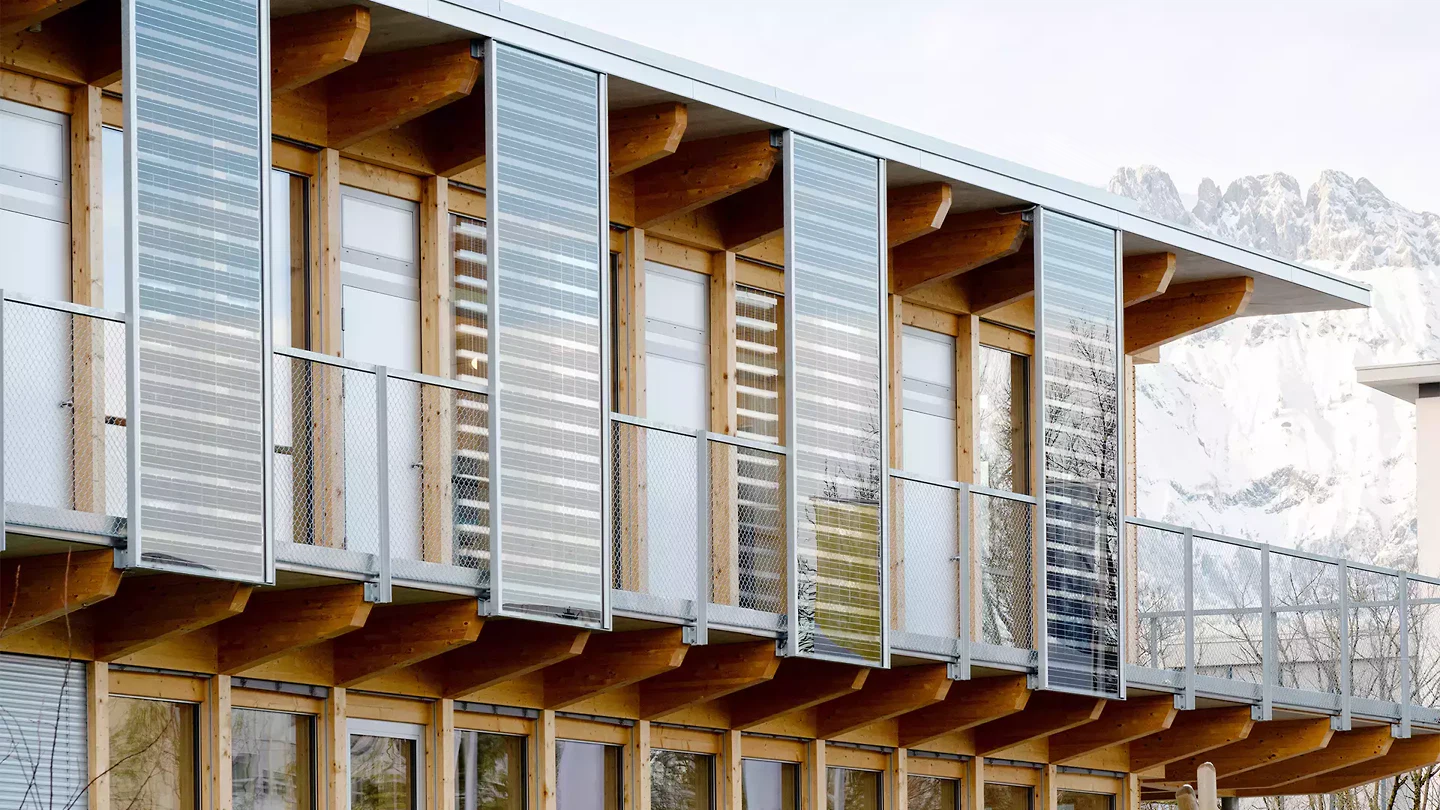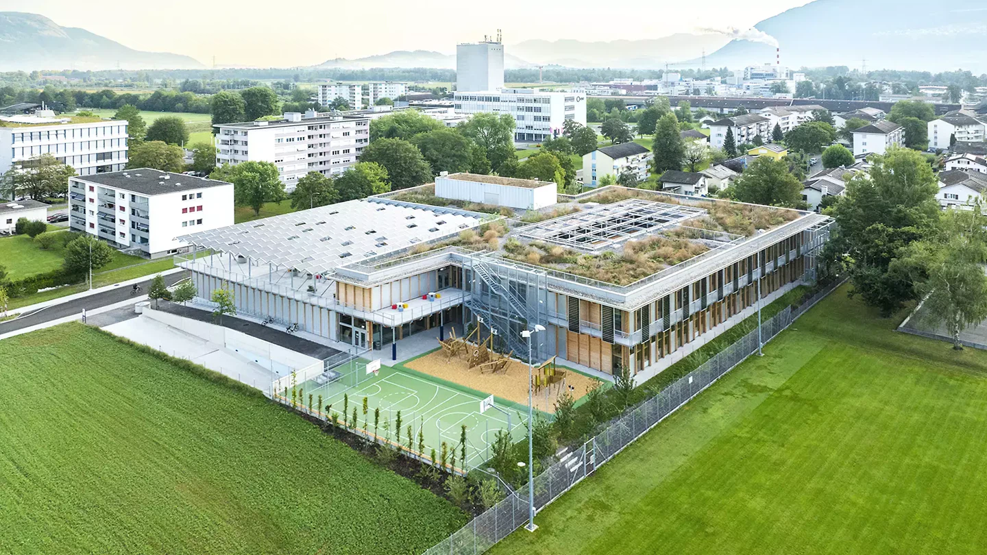 Die Nachhaltigkeitsstrategie ist integraler Teil der Architektur. Photovoltaik auf der Dachterrasse über der Turnhalle und in Fassadenfeldern erzeugt zusammen rund 100 000 kWh pro Jahr und deckt rechnerisch den gesamten Strombedarf der Schule. Zugleich übernehmen die optimal ausgerichteten PV-Elemente eine räumliche und klimatische Funktion: Sie verschatten Terrassen und Fassaden, verbessern die Aufenthaltsqualität und machen die Energieproduktion als Teil des Schulalltags sichtbar. Die Verbundlüftung nutzt Korridore und Begegnungszonen als Frischlufttanks, reduziert den Anlagenaufwand gegenüber konventionellen Systemen um 50 bis 70 Prozent und sorgt bei hohem Komfort für einen ressourcenschonenden Betrieb. Fernwärme, Kühlung mit Grundwasser, Dachbegrünung und Biodiversitätsmassnahmen ergänzen dieses Low-Tech-Konzept zu einem überzeugenden Beitrag für zukunftsfähige Schularchitektur. Die International School Rheintal zeigt damit, wie sich pädagogische Offenheit, konstruktive Klarheit und ökologische Verantwortung zu einer starken architektonischen Gesamtfigur verbinden lassen. Das Gebäude ist nicht nur funktional effizient, sondern baukulturell relevant: ein Schulhaus, das Haltung zeigt und Zukunft räumlich erfahrbar macht.