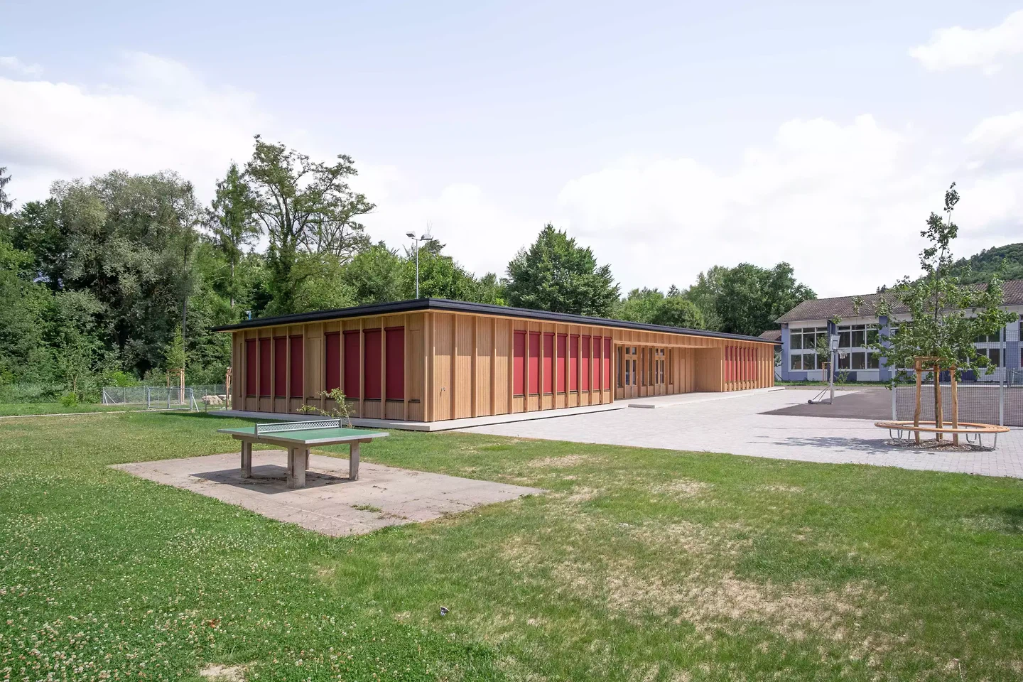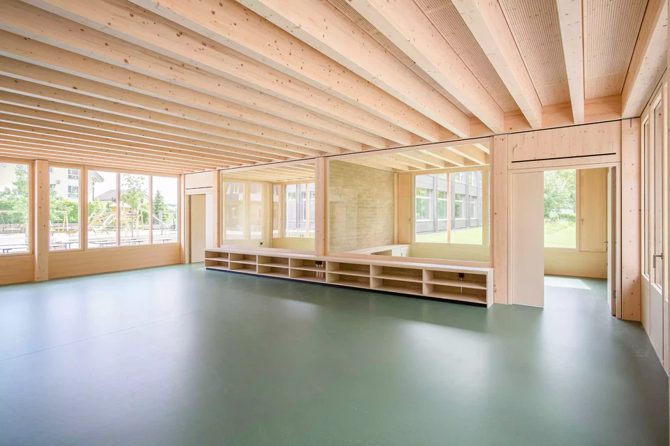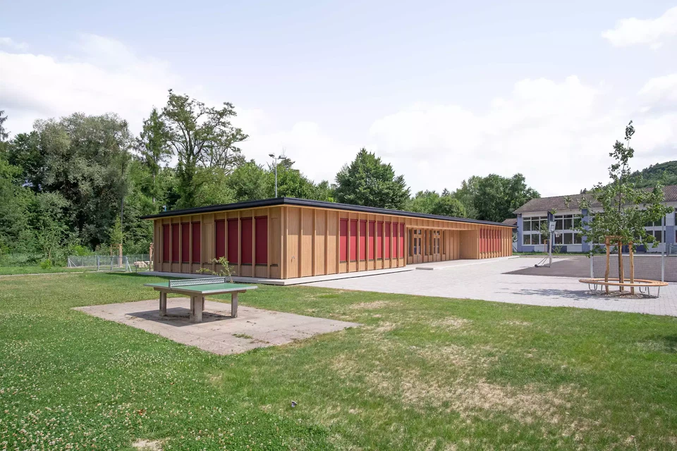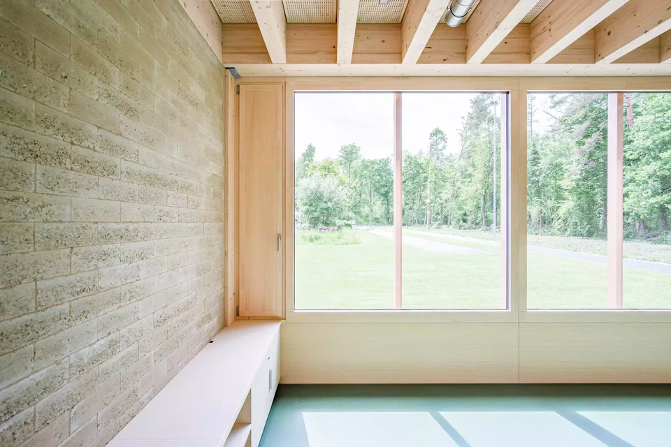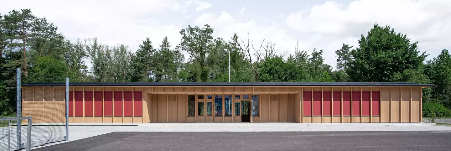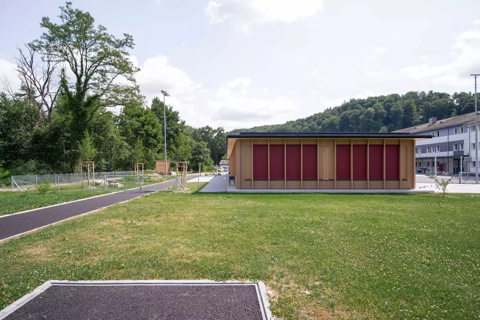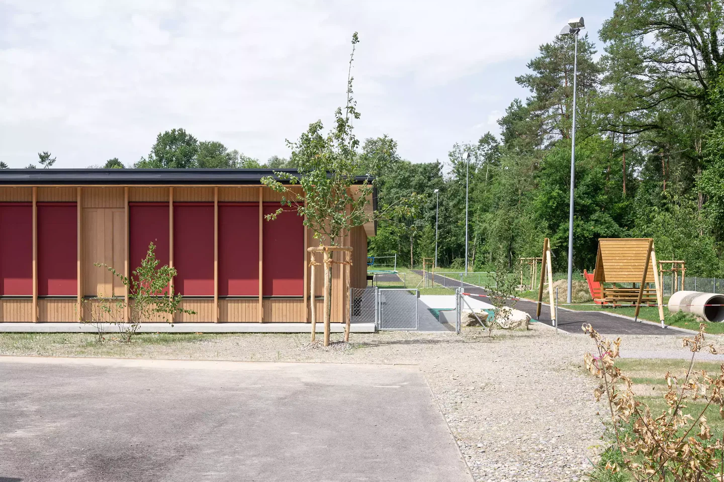 Der Pavillon des neuen Kindergartens in Dotzigen ist ein feines Projekt, das mit seiner Umgebung interagiert – bis hin zu seiner Verschmelzung mit dem angrenzenden Wald. Gleichzeitig stellt er einen Dialog mit den bestehenden Gebäuden her und fasst einen Schulhof. Das Projekt steht im Spannungsfeld zwischen den Gegensätzen Natur und Künstlichkeit.