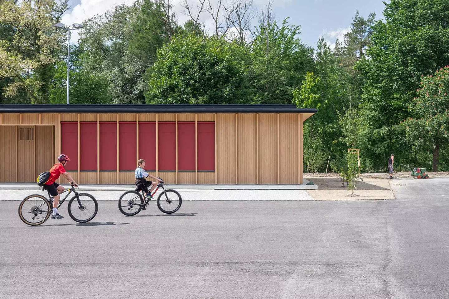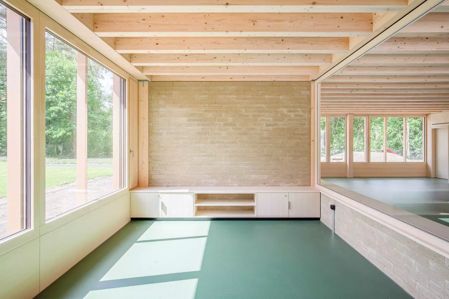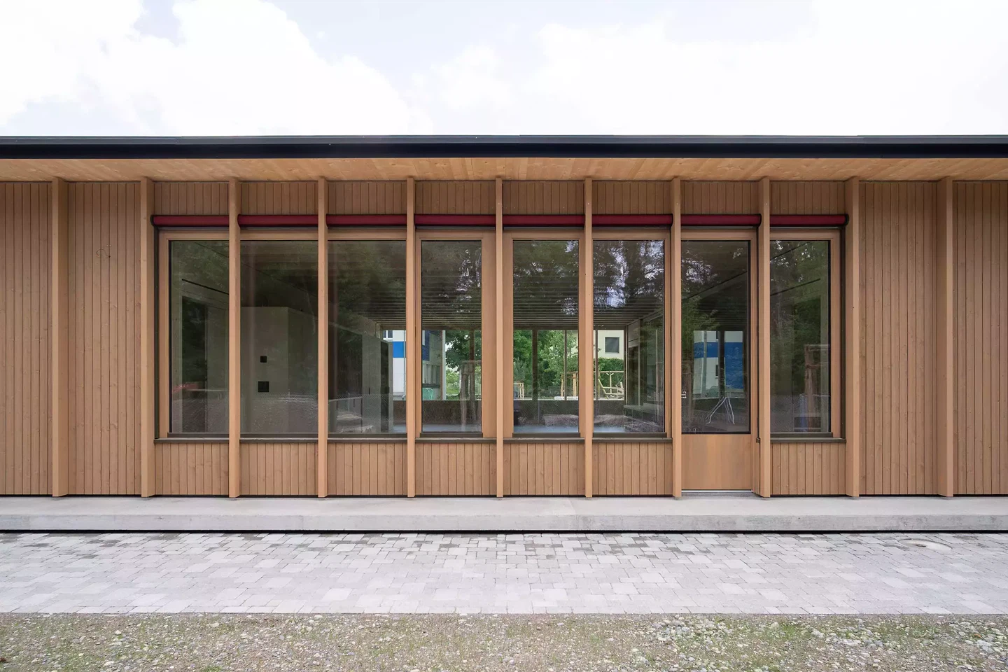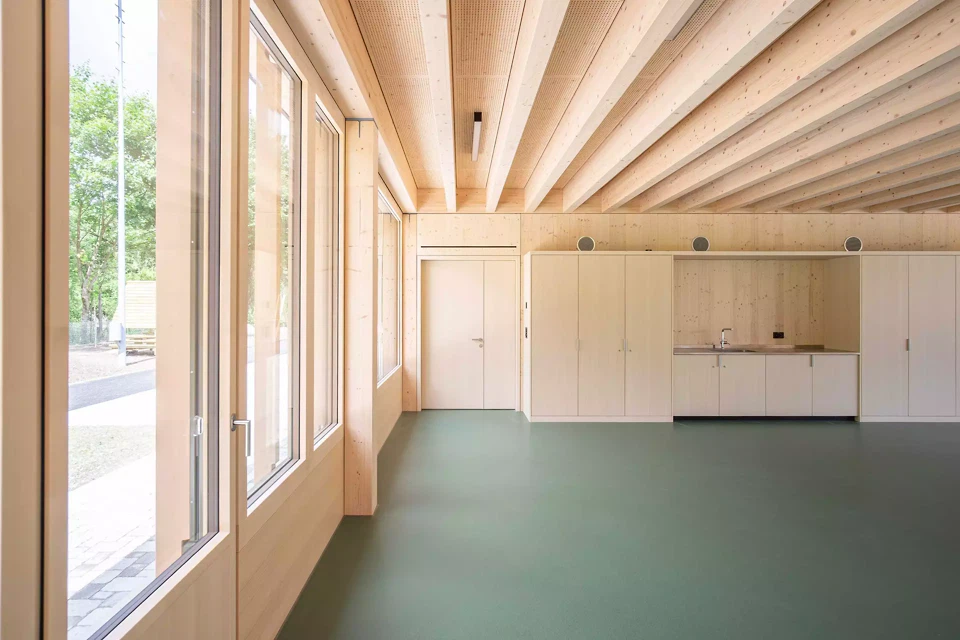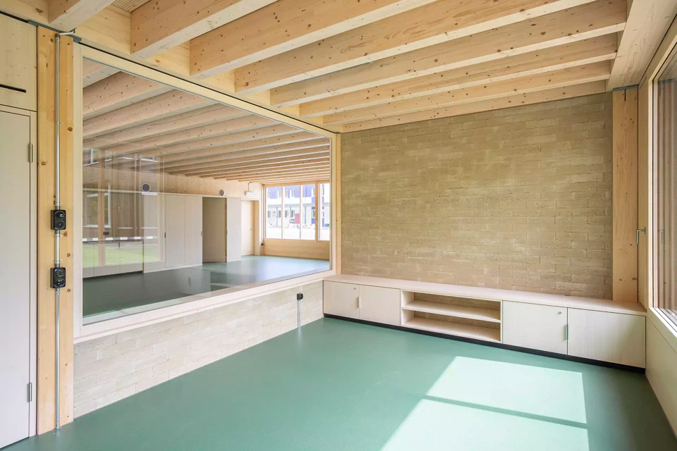 Der Pavillon des neuen Kindergartens in Dotzigen ist ein feines Projekt, das mit seiner Umgebung interagiert – bis hin zu seiner Verschmelzung mit dem angrenzenden Wald. Gleichzeitig stellt er einen Dialog mit den bestehenden Gebäuden her und fasst einen Schulhof. Das Projekt steht im Spannungsfeld zwischen den Gegensätzen Natur und Künstlichkeit.