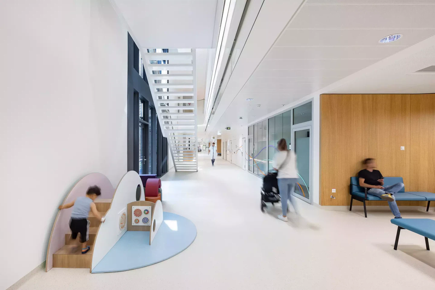 Die Umsetzung der von der UNESCO formulierten Charta der Rechte des hospitalisierten Kindes stellt einen innovativen Ansatz dar. Die Charta bekräftigt das Recht des Kindes, Tag und Nacht von seinen Eltern begleitet zu werden. Daher befindet sich in jedem Zimmer eine in ein Bett verwandelbare Sitzbank, die diesem Bedürfnis gerecht wird. Es wurden zudem Vorkehrungen getroffen, damit ein Elternteil das Kind bis in den Einleitungsraum begleiten kann. Besonderes Augenmerk gilt der warmen Materialität, dem grosszügigen Tageslichteinfall und der spielerischen Signaletik, um die klinische Atmosphäre des Spitals zu mildern. Tageslicht – ein wesentliches therapeutisches Element – wird durch Patios, die zahlreiche Räume sowie die Hauptzirkulation beleuchten, gefördert. Auch das 1. Untergeschoss des Operationsbereichs erhält dank eines neu geschaffenen Lichtgrabens natürliches Licht.