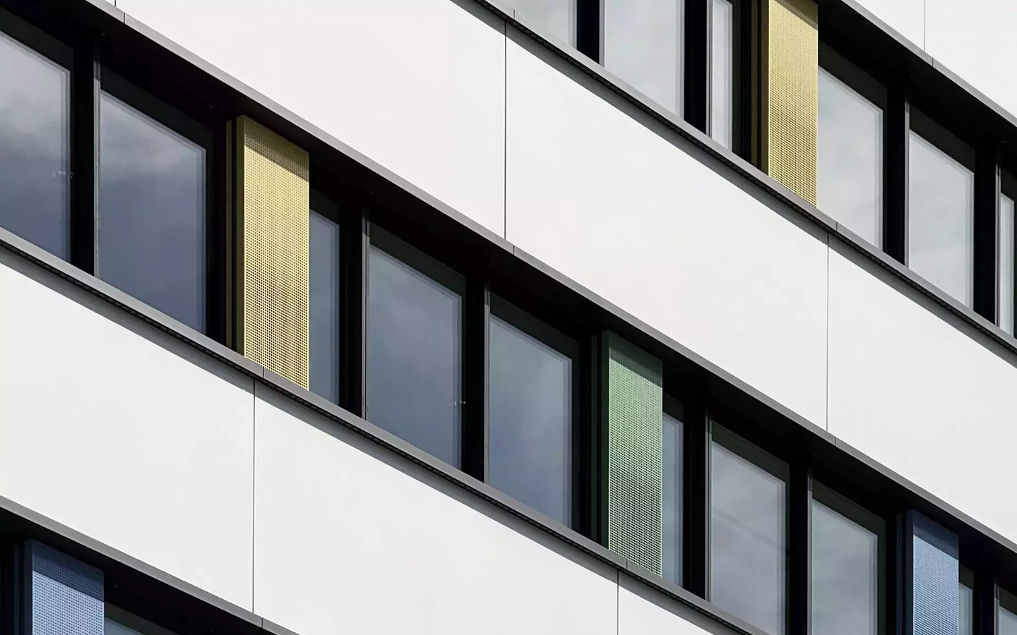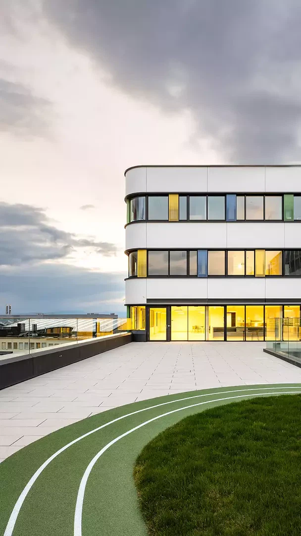 Die Fassadengestaltung interpretiert die horizontalen Bänder des Hauptspitalgebäudes neu. Ihre helle Farbe zieht das Licht an und reflektiert es in die unmittelbare Umgebung. Die blauen, gelben und grünen Lamellen der Öffnungselemente verweisen auf die farbenfrohe Welt der Kinder. Das Dach des Gebäudes B wird als landschaftlicher Bereich ausgestaltet und stärkt die Verbindungen zwischen den verschiedenen Aktivitäten der Spitalstadt. Dieser Garten dient dem Personal als Erholungsraum sowie den Patient*innen als Spiel- und Rehabilitationsort. Auch die Cafeteria nutzt diesen Aussenraum und richtet dort eine Terrasse ein, die allen Mitarbeitenden und Besucher*innen offensteht.