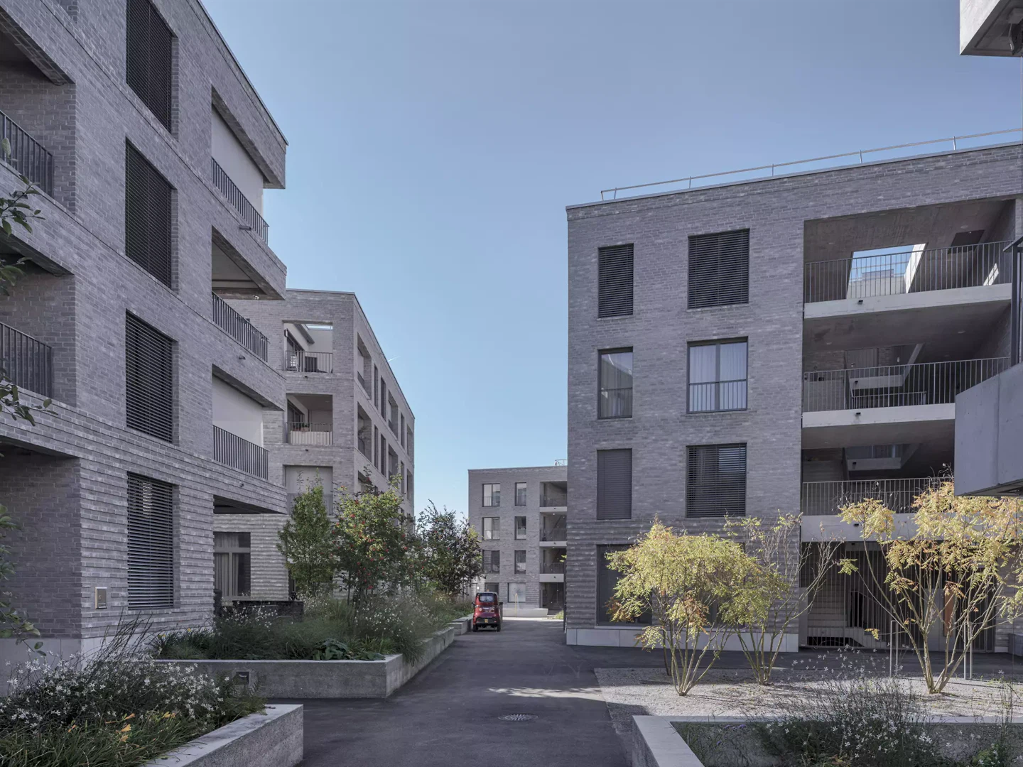Klinker, Sicht- und Stampfbeton prägen die Siedlung, erreichen eine ruhige, zurückhaltende und im Detail präzise Wirkung sowie eine poetische Stimmung. Der Klinker ist auf spielerische Art verlegt; bei den Fassadenflächen im wilden Verband, an den teilweise überhohen Erdgeschossfassaden in abwechselnd hervorstehenden Lagen, um diese als Sockelgeschosse hervorzuheben. Die Fassaden sind zwischen den weiteren Geschossen und beim Dachabschluss mit hervorstehenden Lagen akzentuiert.