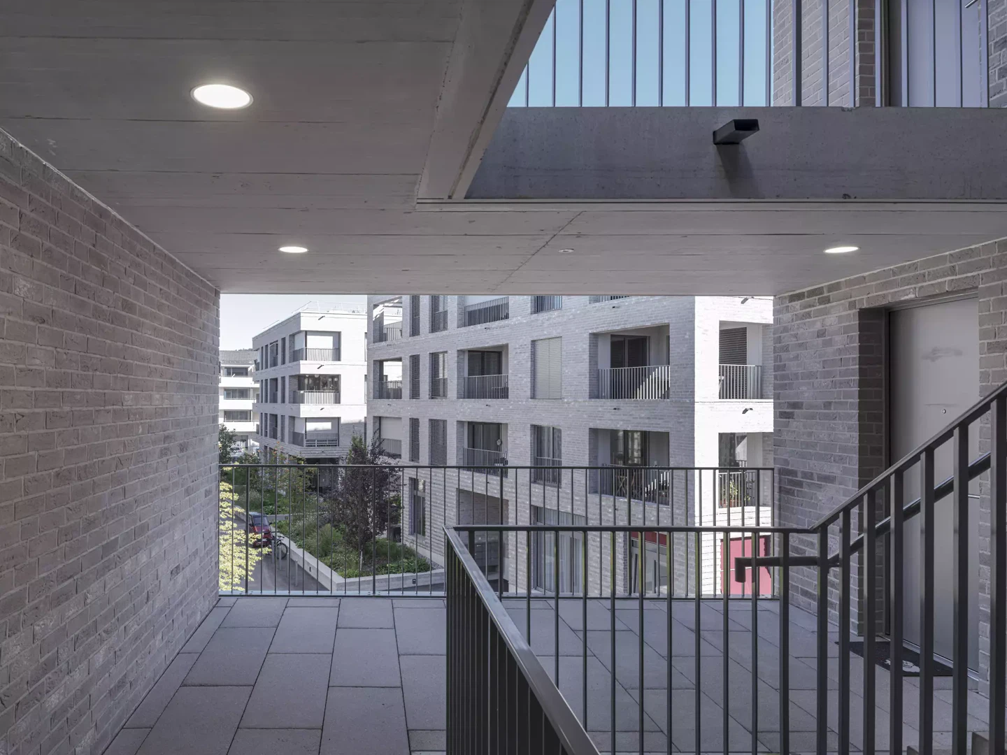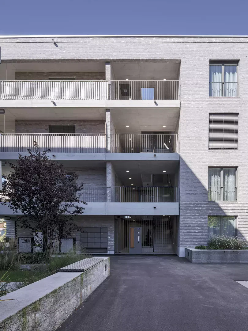 In die Mehrfamilienhäuser gelangt man über offene Treppenhäuser, in denen sich Kletterpflanzen emporranken; die Bewohner*innen begegnen einander auf grosszügigen Erschliessungszonen. Die Aussenräume der Mehrfamilienhäuser sind als Loggien in die Volumetrie der Gebäude integriert. Das Pflegeheim ist mit einem Kopfbau Teil des Ensembles der Mehrfamilienhäuser, der langgezogene Gebäudekörper des Pflegeheims als Schlussstein entlang der Hinwilerstrasse angehängt.