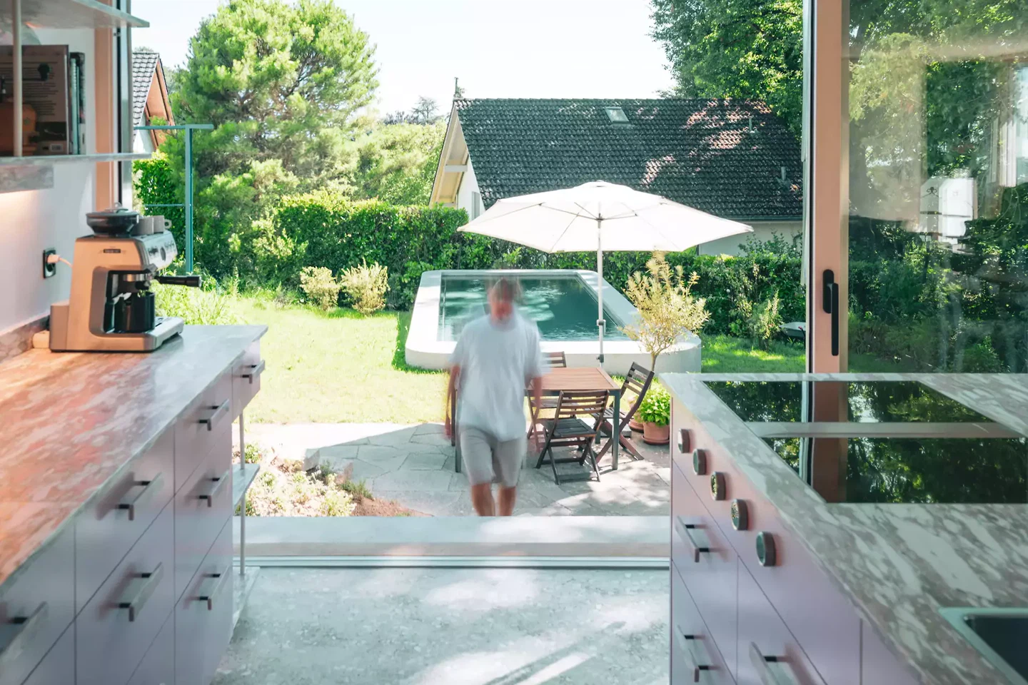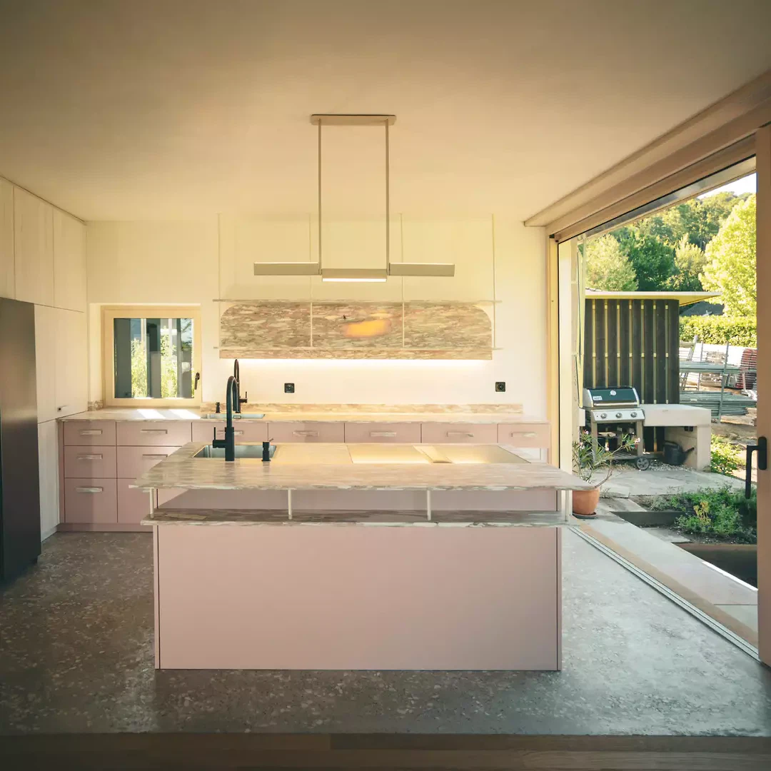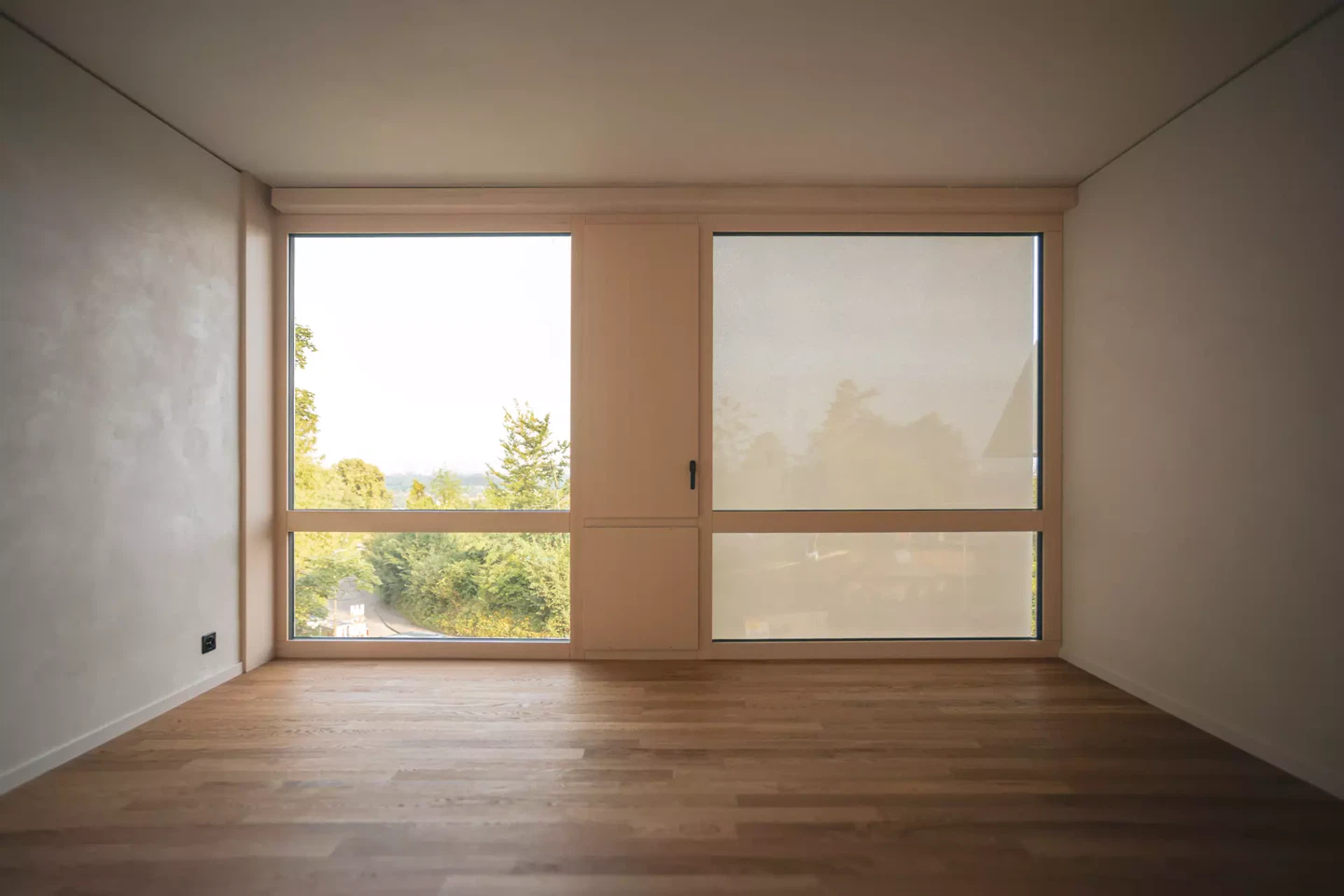 Der erstmalig in einem Gebäude mit Fussbodenheizung verwendete Cleancrete-Boden verzichtet vollständig auf Zement. Oulesse Cleancrete basiert auch auf wiederverwendeten Zuschlägen und reduziert somit den CO₂-Fussabdruck. In der Küche wird durch einen Anschliff eine körnige Struktur als Terrazzo sichtbar und bietet ein haptisch angenehmes Barfuss – Gehgefühl. Die Fassade folgt einer bioklimatischen Logik: Weite Fenster für Querlüftung und Blick ins Tal auf der Hangseite, grosszügige Verglasungen für passive Energiegewinnung im Winter. Überhänge und textile Verschattung mit Fallarmmarkisen verhindern sommerliche Überhitzung. Das Regenwasser wird gesammelt, die Photovoltaik versorgt die Wärmepumpe, das begrünte Dach mit kleiner Sauna interpretiert das Dachgartenprinzip zeitgenössisch. All die Experimentierfreude und die Suche nach der besten lokalen Lösung wäre ohne unsere exzellente Bauherrschaft nicht möglich. Lehm als Baumaterial zur Schaffung eines gesunden Raumklimas wurde von vorneherein eingefordert, die Robustheit des Betons schafft einen würdigen Rahmen und eine zeitlose Eleganz. Der Prozess einer vertieften Planung dauerte ebenso lang wie der Prozess des Bauens. Die Entwurfsphase war geprägt durch Variantenuntersuchungen in einem iterativen Prozess und die Arbeit an Modellen in den Masst.ben 1:200, 1:100, 1:33 sowie Mockups im Masstab 1:1. Das Ziel war, mit den besten Firmen zusammenzuarbeiten. Lehmbau Georg Paul zusammen mit der Lehmag AG weisen eine langjährige Erfahrung mit Lehmsteinmauern auf. Das Vermauern ging somit spielerisch leicht vonstatten. Der Baumeister Huber Straub hat Erfahrungen mit rauhen Betonoberflächen im Basler Zoo gesammelt und das Stocken, sowie die Beschaffung des Recyclingbetons verantwortet.