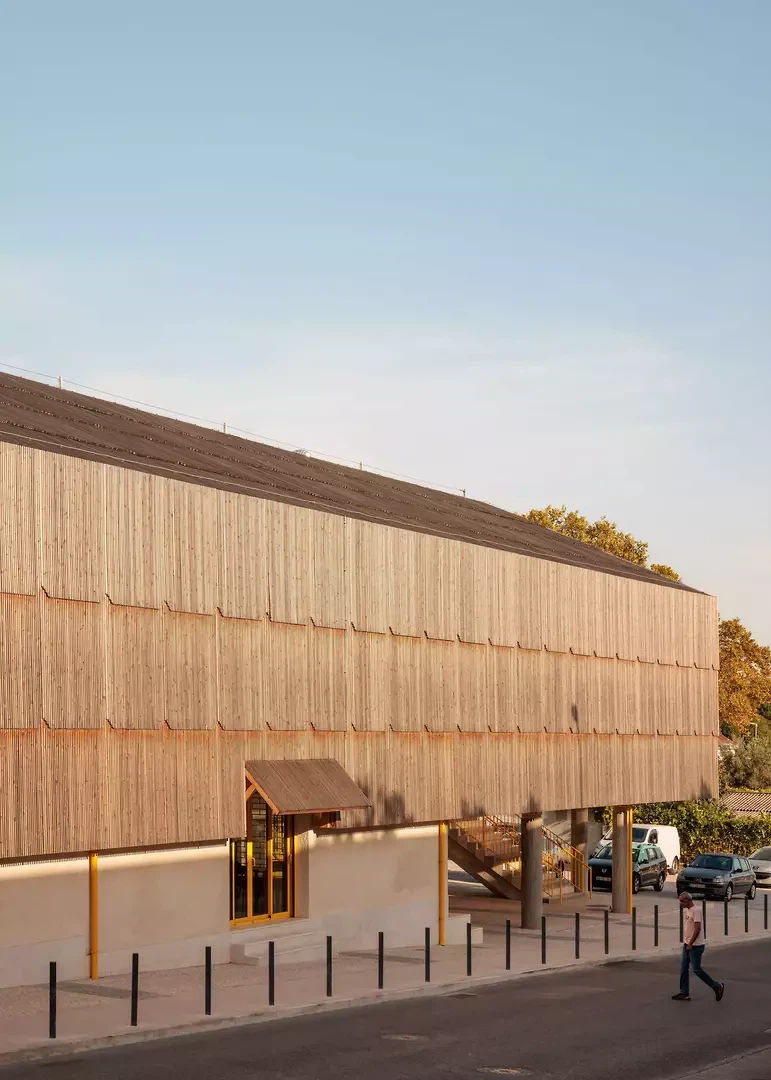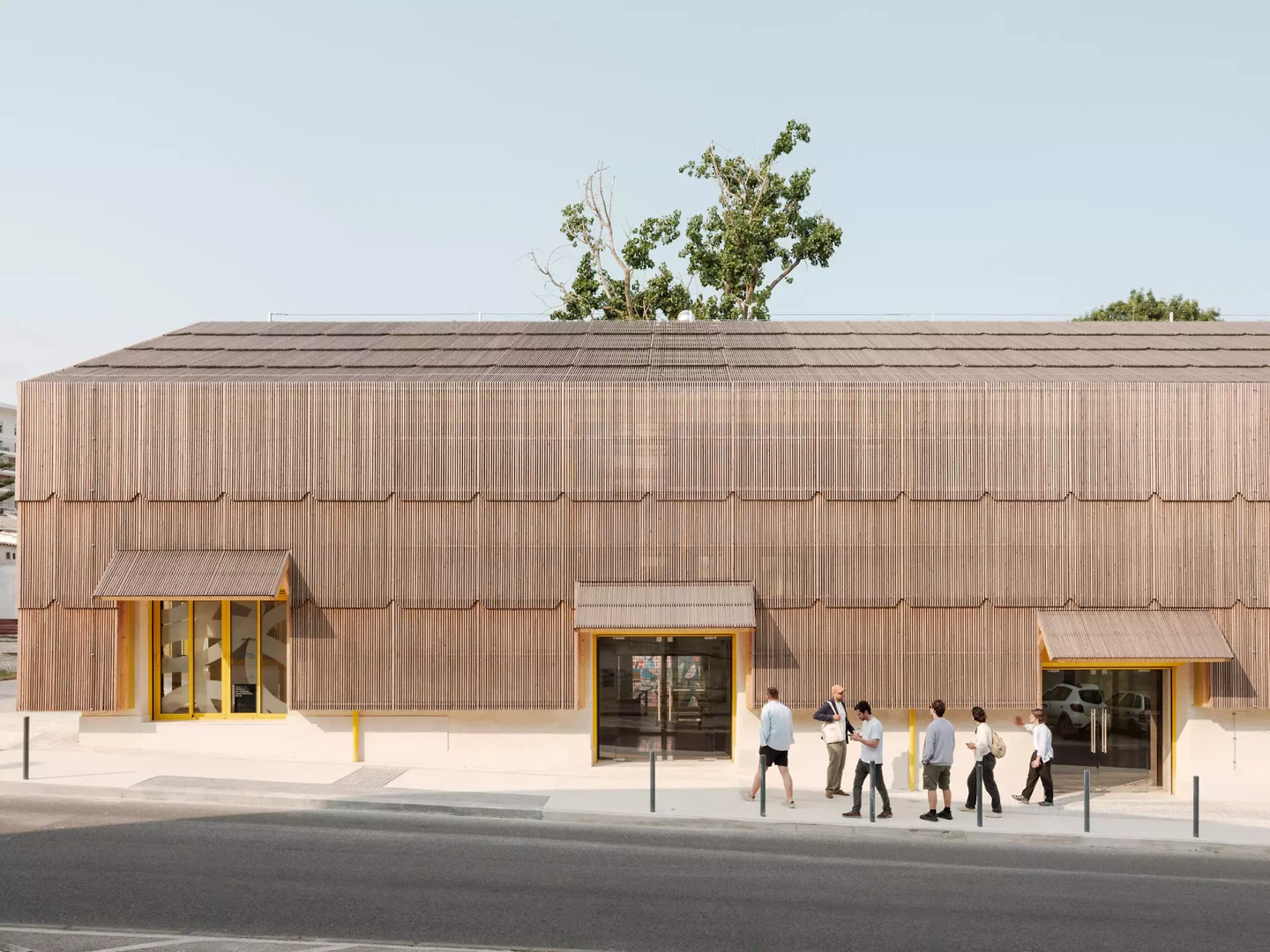 Die Projektvorgaben sahen die Unterbringung aller bestehenden Händler vor, was zu einem partizipativen Prozess auf Basis von Interviews, Analysen und Präsentationen innerhalb der Gemeinschaft führte. Dieses Engagement prägte das Konzept: Die bestehenden Hauptwände wurden erhalten, während polyvalente Bereiche und Infrastrukturen eingeführt wurden. Diese Transformation ermöglichte eine Erweiterung des Raumprogramms nach oben, wobei das erste Obergeschoss Läden beherbergt, die sich zu einer Terrasse öffnen. Dort fördern Aussenbereiche und urbane Landwirtschaftsmodule den Dialog zwischen Konsum und lokaler Produktion. Zwei Treppenanlagen an den Enden des Gebäudes schaffen eine Schleife – einen kontinuierlichen Rundgang, der beide Geschosse verbindet. Gleichzeitig ermöglichen die geneigte Topografie und eine Rampenanlage auf der Terrasse den Zugang zu allen Ebenen. Die Aufwertung der Markthalle wird durch ein überdimensioniertes Holzdach verstärkt, das die Geometrie der ursprünglichen Struktur erweitert. Es trägt die hängenden Ladenvolumen und definiert eine Galerie entlang der Terrasse. Nach Süden hin bildet die Auskragung des Daches einen neuen Lichthof, der temporäre Märkte, Street Art und gemeinschaftliche Veranstaltungen aufnehmen kann.