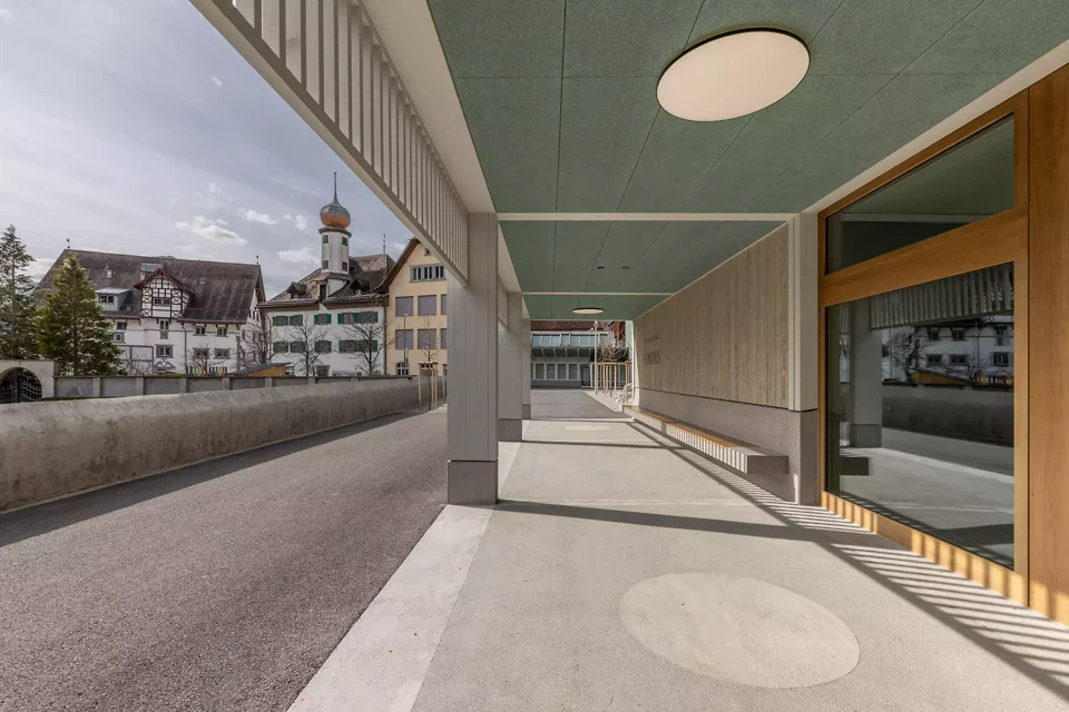 Die neue Mehrzweckhalle ergänzt das Schulensemble als untergeordneter Solitär in unspektakulärer Weise. Durch die Setzung des Baukörpers entstehen verschiedene Pausenbereiche mit unterschiedlichen Qualitäten. Dank des durchlaufenden Portikus wird ein wettergeschützter Pausenbereich angeboten. Der neue Schulhof ist mit hochstämmigen, blühenden Bäumen bepflanzt. Es entstehen geschützte und verkehrsfreie Spielräume. Der neue Platz zwischen dem Schulhaus und dem neuen Mehrzweckbau ist als offene, multifunktionale Fläche ausgestaltet. Das freie Spiel und Ballspiele während der Pausenzeiten finden dort statt. Gleichzeitig kann der Platz auch als aussenräumlicher Publikumsbereich bei Freiluftaufführungen genutzt werden. Generell ist der Fussweg der Schüler konsequent von den Verkehrsflächen und der Parkierung entflochten. Die Sicherheit und Übersichtlichkeit gehen einher mit der freiräumlichen Qualität.