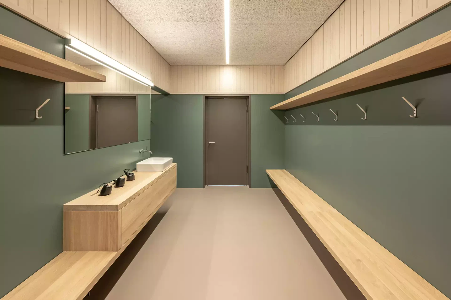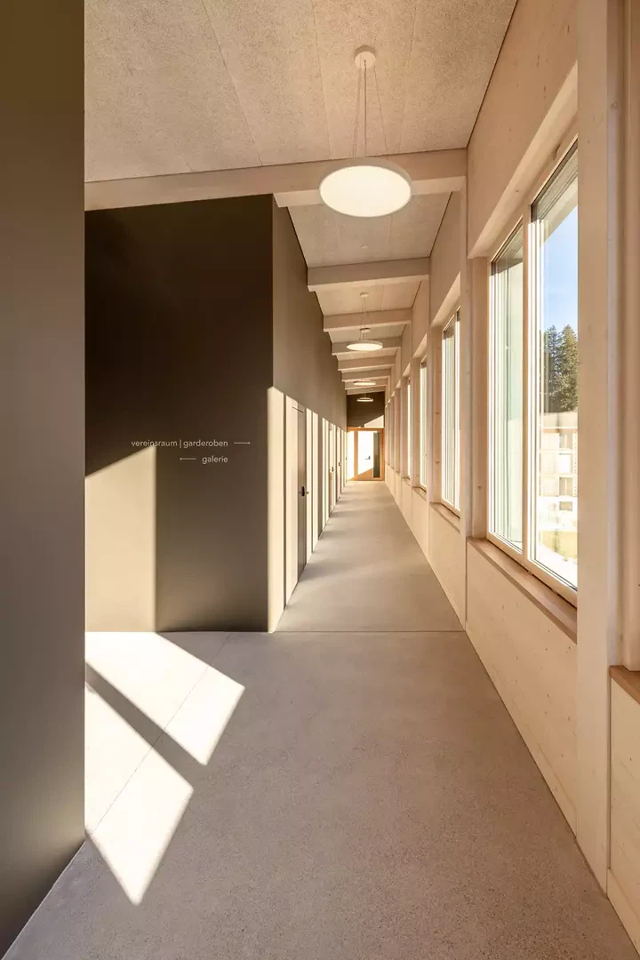 Garderoben, funktionale Nebenräume und der Vereinsraum befinden sich im Obergeschoss. Die Erschliessungsfläche erhält durch grosszügige Fensteröffnungen viel Tageslicht und die Orientierung ist einfach. Gemäss Schmutzschleusenkonzept zonieren die Garderobenräume die Turnhallennutzung in Schmutz- und Sauberbereich. Von der Galerie ist der Blick in die Halle möglich und es entstehen interessante Sichtbezüge. Der Vereinsraum steht als nutzungsneutraler Raum den Grüscher Vereinen zur Verfügung. Die Medientechnik ist darauf ausgelegt, dass auch Versammlungen in diesem Raum abgehalten werden können. Die Nischen an der Längsseite dokumentieren die Geschichte der Gemeinde Grüsch und der Mehrzweckhalle.