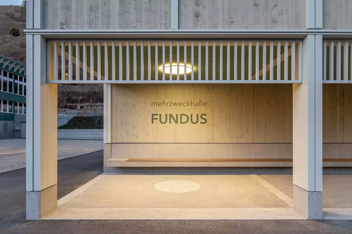 Der neue Mehrzwecksaal Fundus wird mit einer abtrennbaren Mehrzweckbühne ausgestattet. Die Turnhalle kann tagsüber primär durch den Schulsport und abends durch die Sportvereine genutzt werden. Für Mehrzweckveranstaltungen kann der Bühnenraum zur Turnhalle geöffnet werden, er ist aber auch als separater Raum nutzbar. Die Bühne weist ein Bühnenportal von 10 Meter Breite und 5 Meter Höhe auf und ist für diverse Veranstaltungen geeignet. Die Bühne ist zweiseitig nutzbar: einerseits als konventionelle Guckkastenbühne mit dem Zuschauer in der Turnhalle, andererseits als Aussenbühne mit dem Publikum openair auf dem Schulhof. Das Konzept sieht von Veranstaltungen, Konzerten, Schulbetrieb und Gemeindeversammlungen über Theater, Kino und Freilufttheater diverse Nutzungsmöglichkeiten vor. Die Bühneneinrichtungen sind dementsprechend ausgelegt. Die Besonderheit der auch von aussen nutzbaren Bühne wird durch die Beidseitigkeit ermöglicht. Dadurch wird der zwischen Schulhaus und Mehrzweckhalle liegende Schulhof in Folge verschiedener Nutzungsszenarien zum einem wertvollen und bereichernden Aussenraum. Gleichzeitig wirkt die Bühnenfassade gegenüber der Schulanlage einladend, offen und zugewandt.