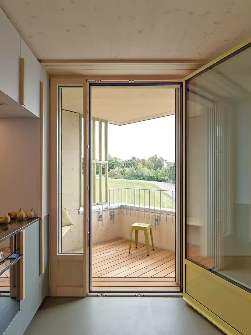 Die Mini-Appartements sind Gehäuse mit eigener «Persönlichkeit», ein Spiel zwischen Möbelbau und Architektur. Die Grundflächen der meist überhohen Räume sind mit Bedacht aufgeteilt, die Wände mit der Sorgfalt eines Möbelbauers ausgebildet: Eingelassene Schränke, Aufgänge, Nischen und Schlafkojen kommen im Gebrauch zur Entfaltung. Kastenfenster erweisen sich als kontemplative Sitzbank. Aussen zeigt sich Kibako als elegant gezackter Holzbau, dessen schützender Hut auf der Gemeinschaft ruht. Dem aus Nut- und Feder-Elementen gefügten Bau gewinnen Deckleisten Rhythmus und Tiefe ab – wie überhaupt das ganze Haus von Gestaltungswillen, Liebe zum Detail und Holz durchdrungen ist.