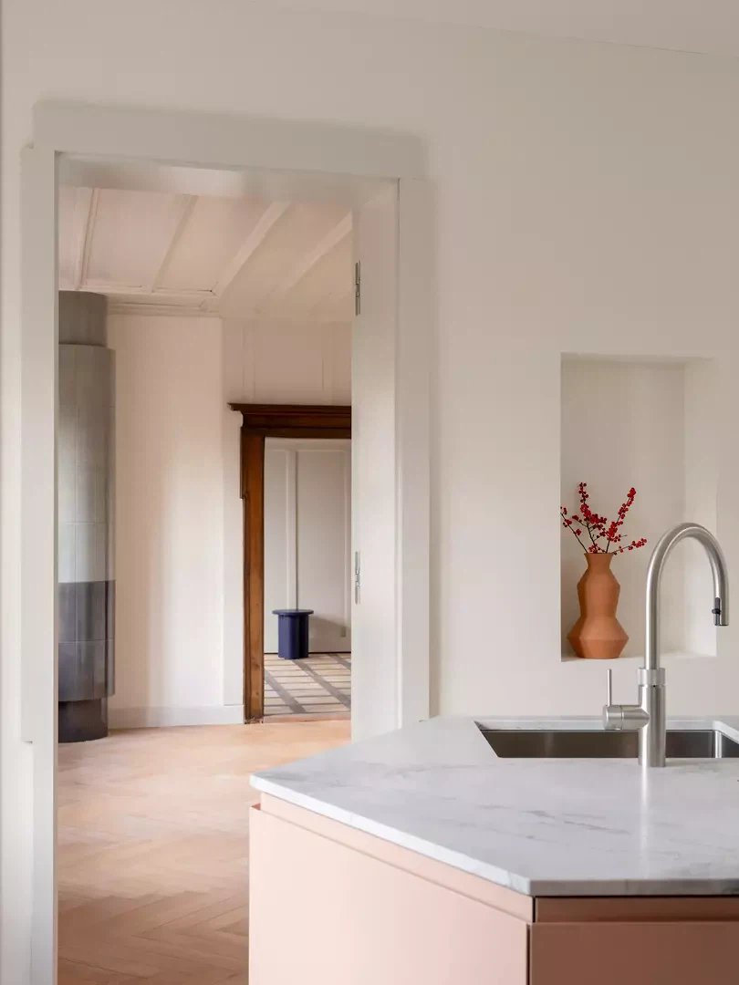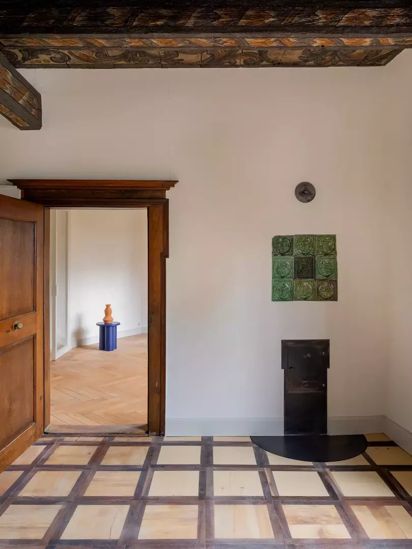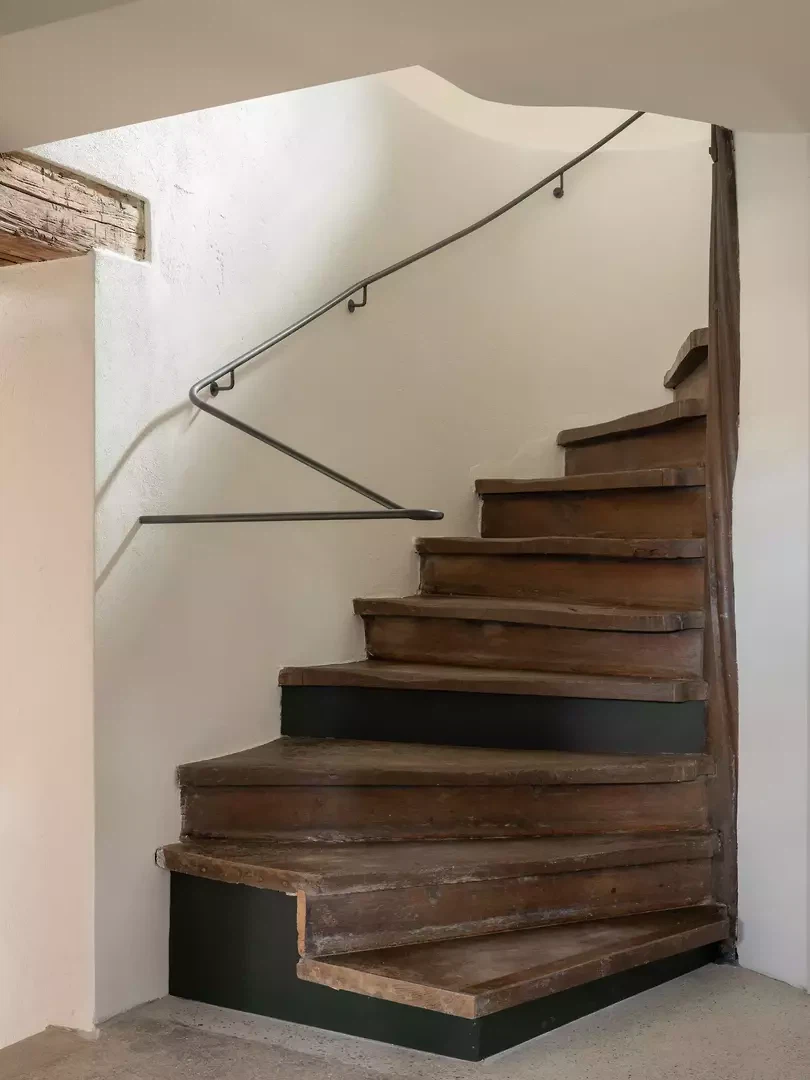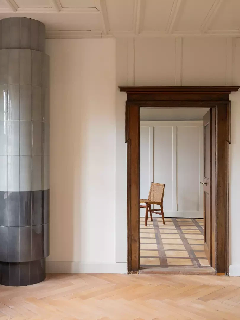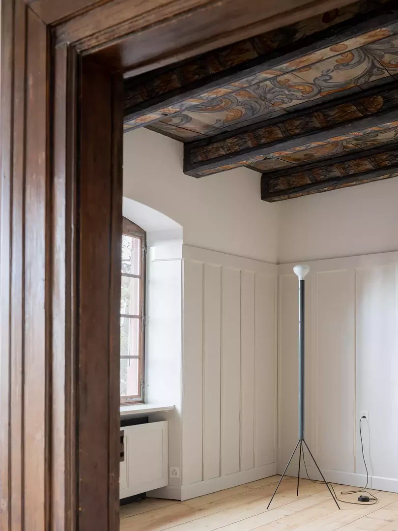 Besonderes Augenmerk galt den historischen Ausstattungsmerkmalen. Die barocke, kunstvoll bemalte Balkendecke in den östlichen Räumen wurde sorgfältig restauriert, sodass ihr malerischer Ausdruck wieder vollständig zur Geltung kommt. Auch die Eichentreppe aus derselben Zeit wurde behutsam saniert: Bestehende Elemente wurden neu ausgerichtet, fehlende Teile sichtbar ergänzt, sodass die Treppe weiterhin als skulpturales und prägendes Element des Hauses wirkt. Neue architektonische Eingriffe wurden bewusst auf die vorhandene Substanz abgestimmt. Proportion, Materialwahl und Ausführung orientieren sich an der historischen Bausubstanz und interpretieren diese zurückhaltend in zeitgemässer Form. Ein neuer Kachelofen wurde beispielsweise als skulpturales Element in die Räume integriert und greift gleichzeitig den historischen Bezug des Hauses auf. Neben den denkmalpflegerischen und gestalterischen Massnahmen wurde das Gebäude technisch umfassend erneuert. Die Heiztechnik wurde von Gas auf Fernwärme umgestellt, historische Fenster erhielten moderne Vakuumverglasungen, ohne ihren authentischen Ausdruck zu verlieren. Feuchte Kellerbereiche konnten mithilfe von Elektroosmose dauerhaft getrocknet werden.