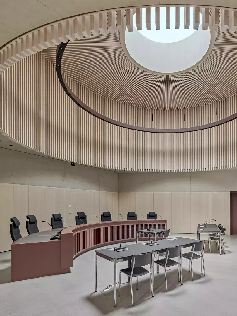 Die Herausforderung bestand darin, ein repräsentatives Holzgebäude in einer von Topografie, Infrastrukturbauten und starkem Verkehr geprägten Umgebung zu errichten – ein Bauwerk, das sich harmonisch einfügt und zugleich selbstbewusst auftritt. Das Herzstück bildet der grosse, doppelgeschossige Gerichtssaal im polygonalen Betonkern. Seine fünfeckige, achsensymmetrische Grundrissform ergibt sich aus der Parzelle und der Nachbarschaft. Durch den runden Luftraum und das Zenitallicht entsteht eine Atmosphäre von Konzentration, Ernsthaftigkeit und Klarheit – Qualitäten, die dem Charakter einer Gerichtsverhandlung entsprechen und einen würdigen Rahmen schaffen.