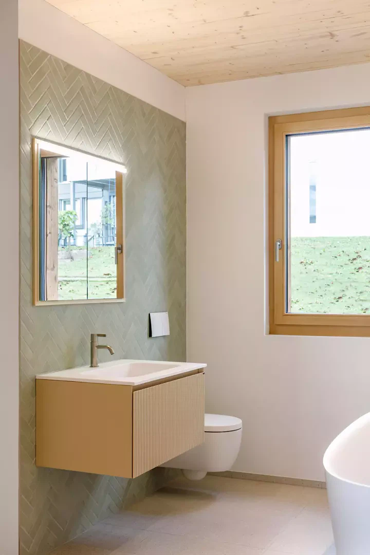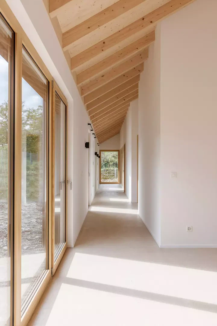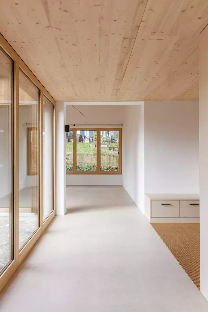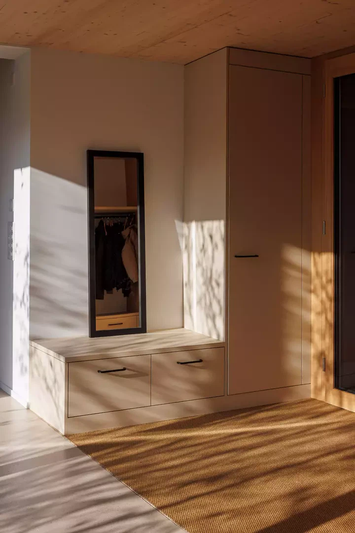 Im Inneren prägt eine nordisch inspirierte Materialisierung die Atmosphäre: sichtbare Fichtensparren, helle Holzfenster, weisse Wände und Einbaumöbel sowie ein geschliffener, eingefärbter Unterlagsboden bilden die Basis. Akzentuiert wird der Innenausbau durch grüne Küchenfronten und farbige Wandplatten in den Nassräumen. Die Umgebungsgestaltung folgt einem minimalistischen Ansatz. Sanfte Terrainmodellierungen, Kiesflächen im Hof und gezielt gesetzte Bäume mit intensiver Herbstfärbung unterstreichen die architektonische Klarheit und setzen einen lebendigen Kontrast zur braunen Holzfassade.