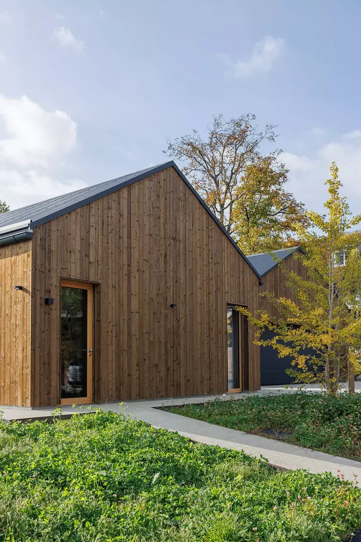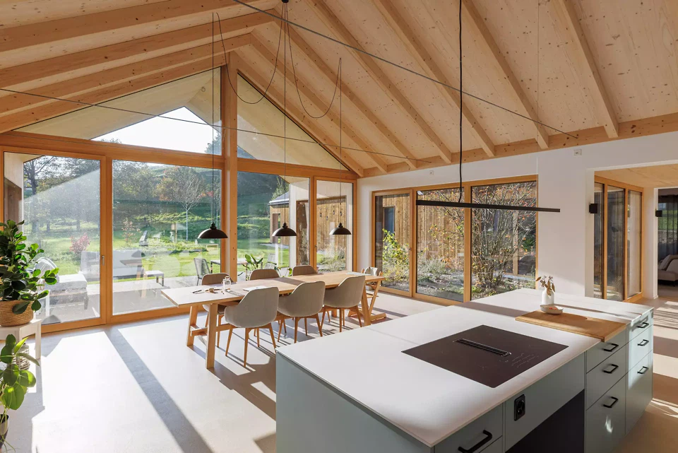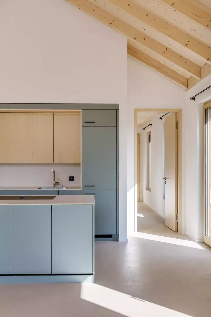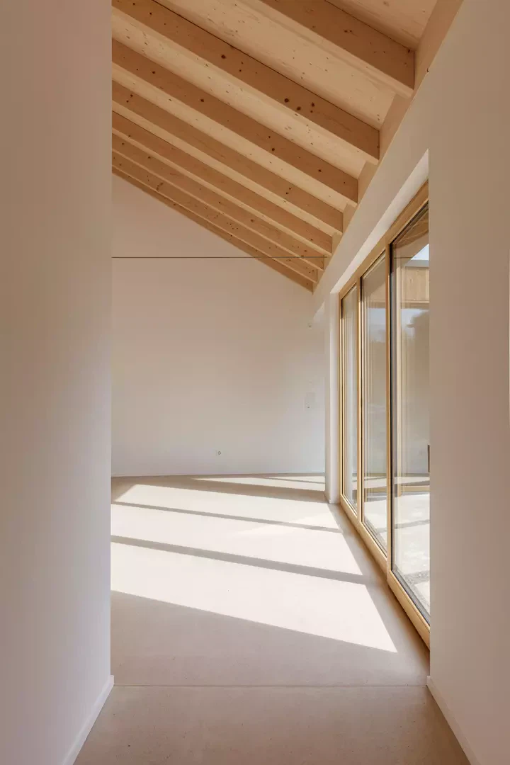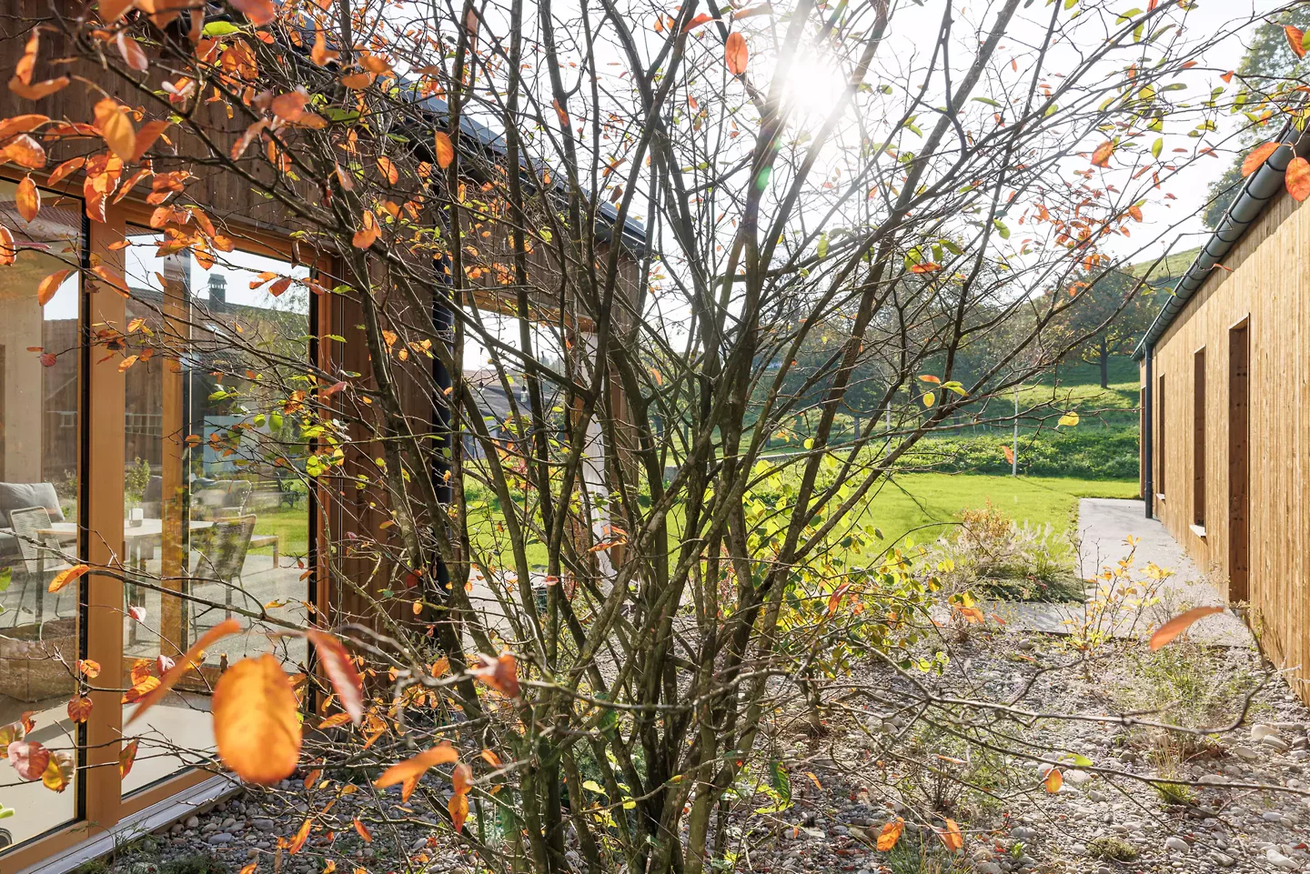 Im Inneren prägt eine nordisch inspirierte Materialisierung die Atmosphäre: sichtbare Fichtensparren, helle Holzfenster, weisse Wände und Einbaumöbel sowie ein geschliffener, eingefärbter Unterlagsboden bilden die Basis. Akzentuiert wird der Innenausbau durch grüne Küchenfronten und farbige Wandplatten in den Nassräumen. Die Umgebungsgestaltung folgt einem minimalistischen Ansatz. Sanfte Terrainmodellierungen, Kiesflächen im Hof und gezielt gesetzte Bäume mit intensiver Herbstfärbung unterstreichen die architektonische Klarheit und setzen einen lebendigen Kontrast zur braunen Holzfassade.