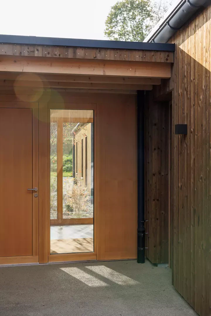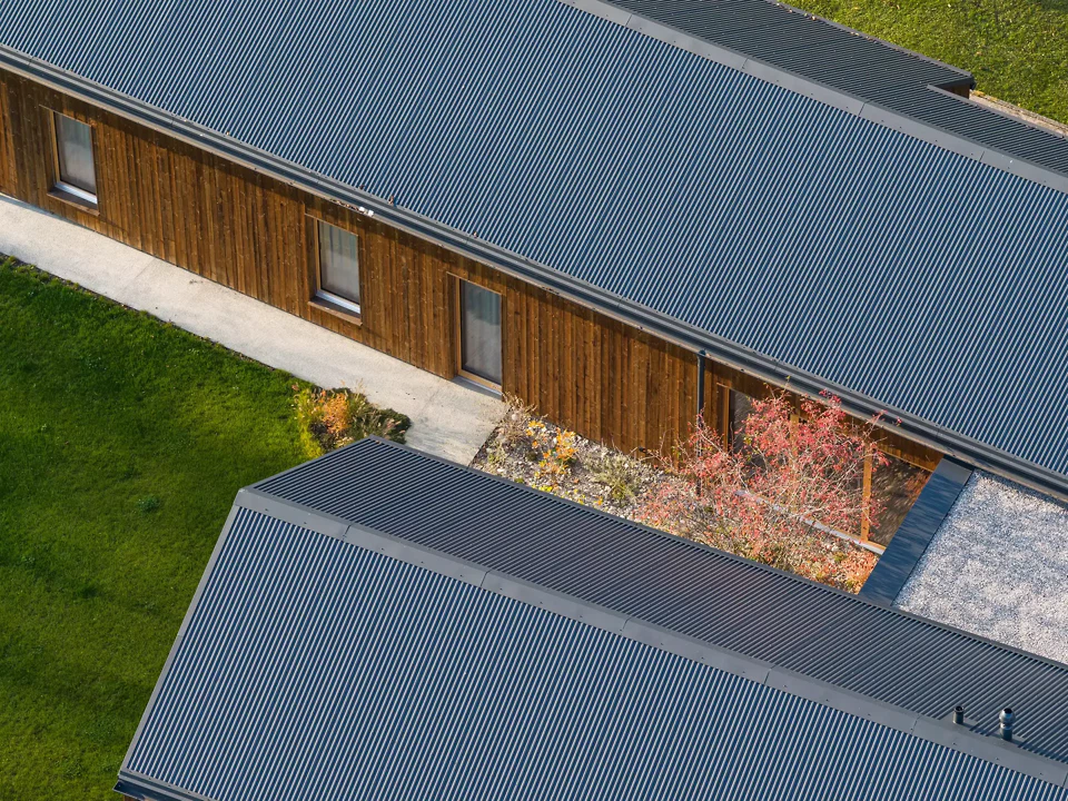 Die Parzelle wurde als Ensemble entwickelt. Das Einfamilienhaus positioniert sich im Norden als eingeschossiger, in die grüne Umgebung eingebetteter Baukörper. Die leicht abgewinkelten Flügel öffnen sich nach Westen und zum Innenhof und zonieren durch ihre Setzung differenzierte Aussenräume. Der längere Gebäudeflügel nimmt die privateren Nutzungen auf: Schlafzimmer, Wohnbereich, Technik und Doppelgarage sind funktional klar gegliedert. Gezielte Fassadeneinschnitte sowie ein Lüftungshof bringen zusätzliches Tageslicht in die Räume und schaffen ein hohes Mass an Privatheit. Im kürzeren Flügel befinden sich Küche und Essbereich mit grosszügiger Westorientierung, ergänzt durch Büro- und Nebenräume. Beide Flügel öffnen sich mit grossen Fensterflächen nach Westen und zum geschützten Innenhof und schaffen fliessende Übergänge zwischen Innen- und Aussenraum. Der Zwischentrakt dient als verbindendes Element und Verteiler zwischen den privaten und den öffentlicheren Wohnbereichen. Das Gebäude ist ein Holzbau in Holzelementbauweise auf einem umlaufenden Betonsockel, der zugleich als Erschliessungs- und Bewirtschaftungsweg dient. Eine innen aufgestellte Wärmepumpe mit Bodenheizung sorgt für eine zeitgemässe Haustechnik.