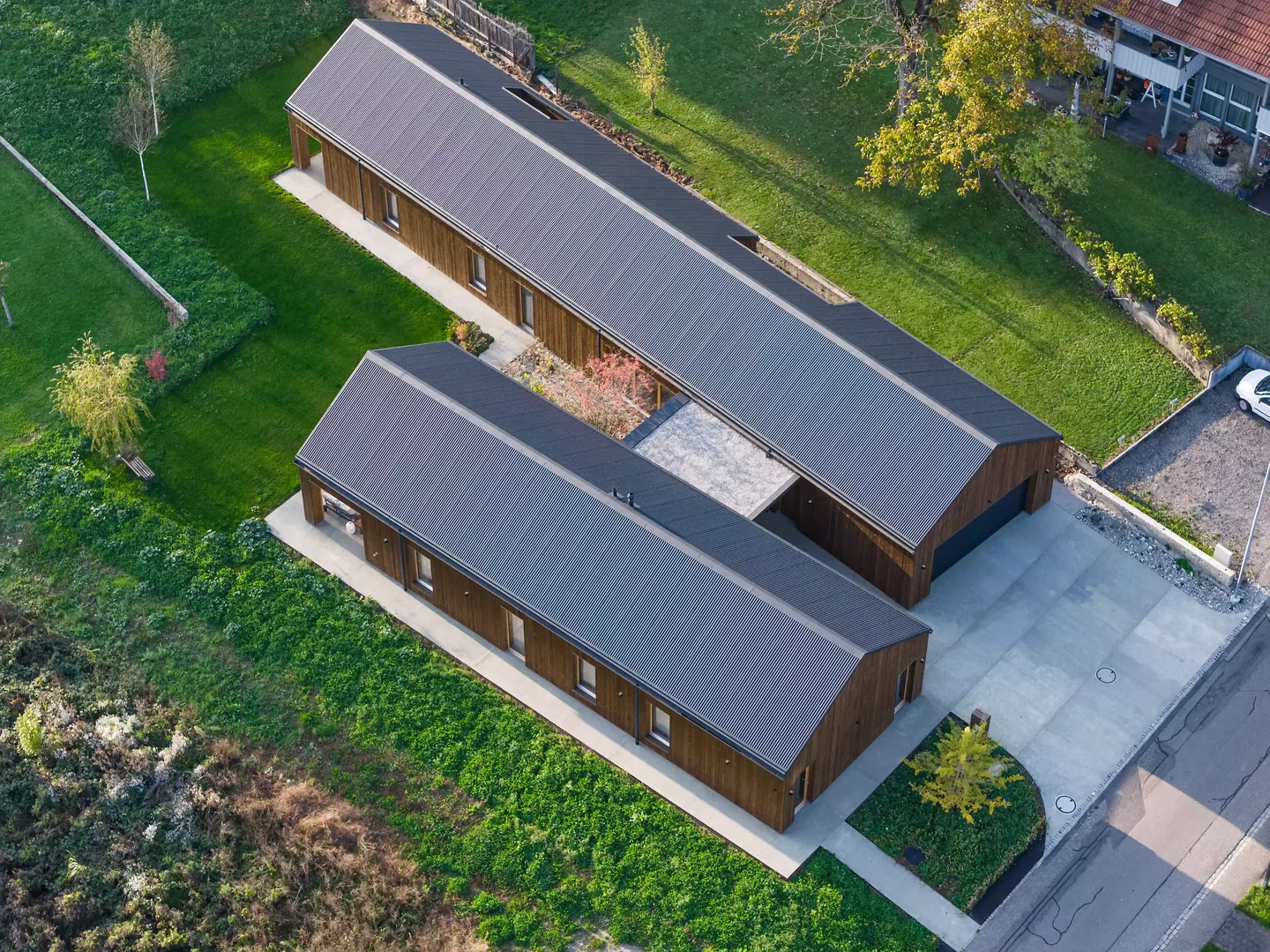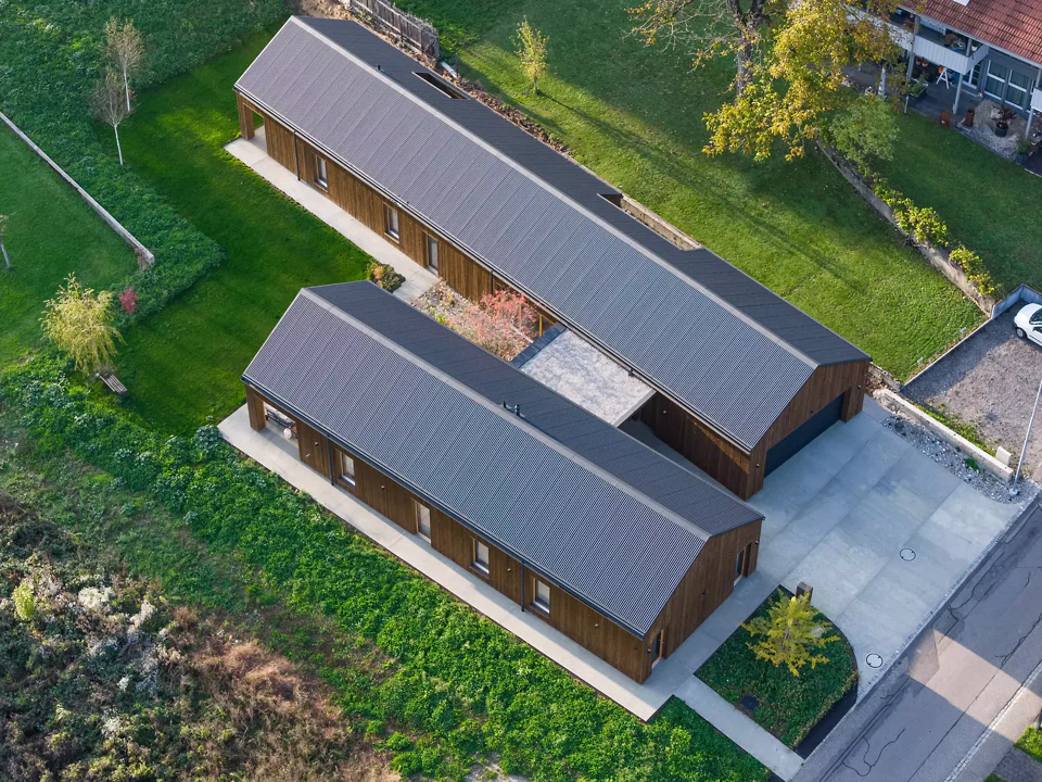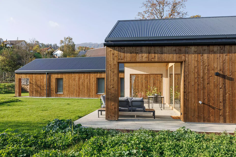 Die ehemalige Sägereiparzelle wurde als städtebauliches Gesamtbild entwickelt. Neben dem realisierten Einfamilienhaus ist auf dem Grundstück ein Mehrfamilienhaus geplant, das sich derzeit in der Planungsphase befindet und das Ensemble künftig ergänzt. Das Einfamilienhaus ist als zweiflüglige Typologie mit leicht zueinander abgewinkelten Baukörpern und Satteldächern konzipiert, wodurch differenzierte Hofsituationen entstehen. Grosszügige Öffnungen nach Westen und zum privaten Innenhof schaffen fliessende Übergänge zwischen Innen- und Aussenraum, während gezielte Fassadeneinschnitte und ein Lüftungshof eine diskrete Lichtführung und hohe Privatheit ermöglichen. Die vorverwitterte Holzschalung wird durch einen zurückhaltenden Betonsockel ergänzt und durch einen hochwertigen Innenausbau weitergeführt. Als eingeschossiger Bau ohne Unterkellerung überzeugt das Gebäude durch eine klare, hindernisfreie Organisation. Die Umgebungsgestaltung mit sanfter Topografie und gezielter Baumsetzung unterstreicht die ruhige Einbindung in den Ort.