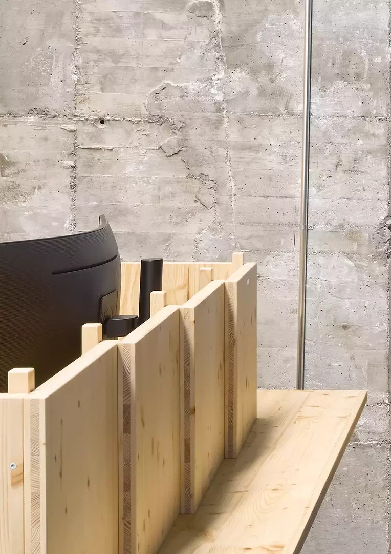 Eine Wand aus seriell gefertigten Holzpaneelen kombiniert geschlossene und transluzente Felder. Die Elemente sind in präzise gearbeiteten Buchenrahmen gefasst und jeweils um fünf Grad gegeneinander versetzt. Gerilltes Glas streut das Licht gleichmässig in den Trainingsraum.