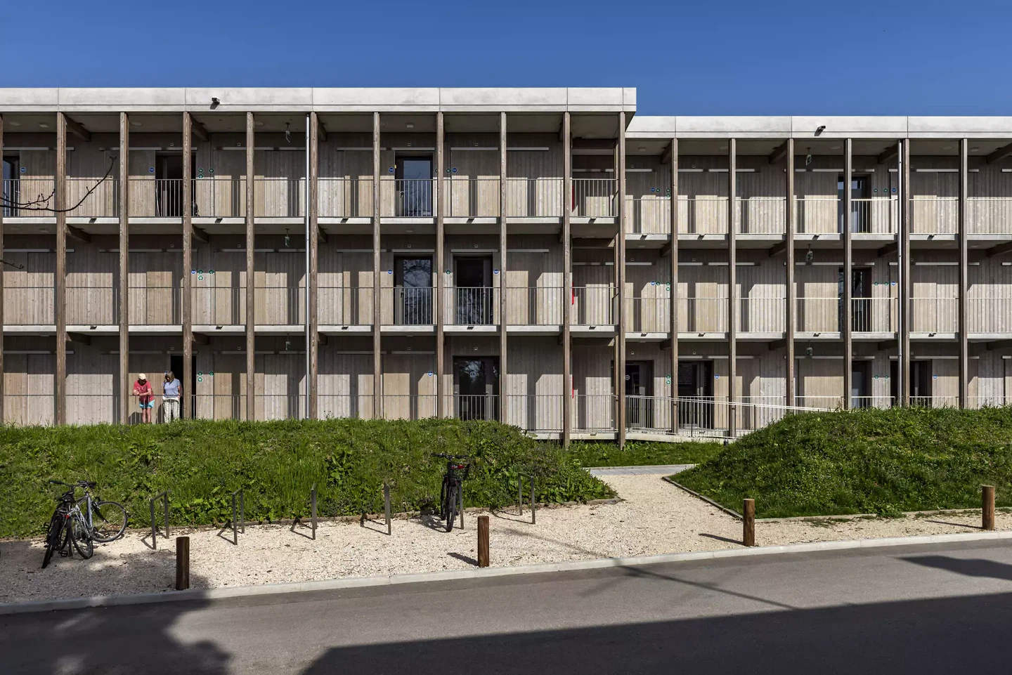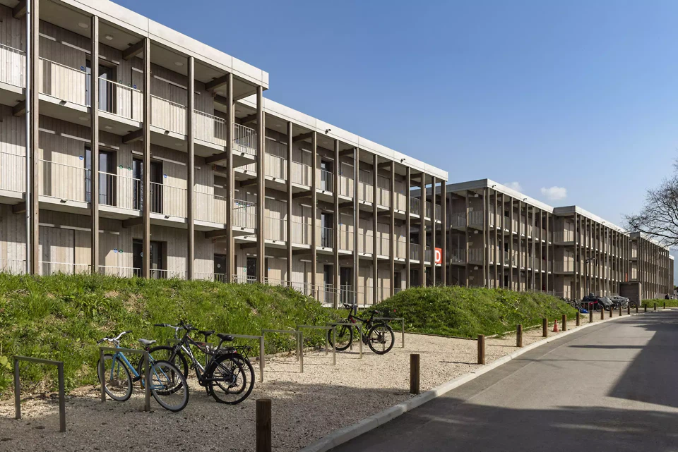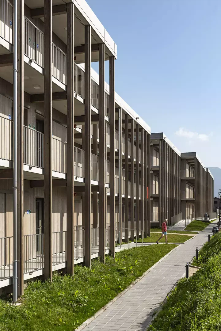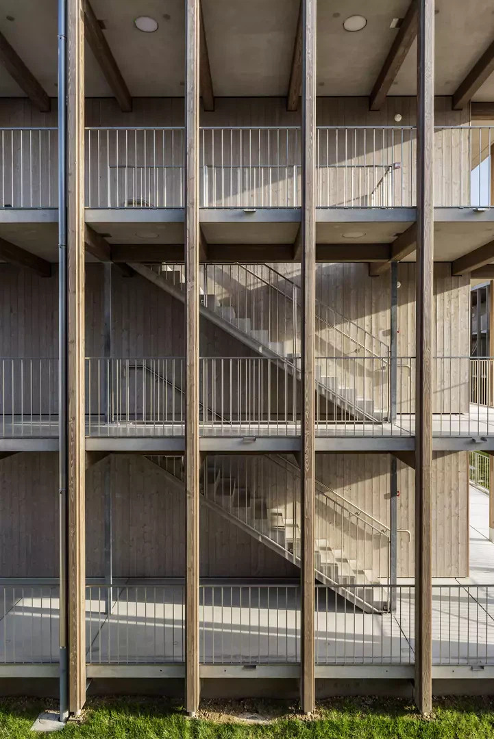 Um die gesetzten Ziele zu erreichen, richtete sich die Überlegung früh auf das Bausystem, die Materialinnovation und die technische Experimentierung. Die Vorfertigung bildete den Ausgangspunkt, da sie eine präzise Kontrolle des Bauprozesses ermöglicht und sowohl eine schnelle Ausführung als auch architektonische Qualität gewährleistet. Parallel dazu wurde die Materialwahl von dem Wunsch geleitet, eine warme und einladende Atmosphäre zu schaffen, im Einklang mit dem ländlichen Kontext des Standorts. Holz erwies sich als naheliegende Wahl, da es einem grossen Bauensemble eine häusliche Dimension verleiht.Das gewählte System kombiniert vorgefertigte Elemente aus Holz und Beton und nutzt die mechanischen Eigenschaften beider Materialien (Druck für Beton, Zug für Holz), um die strukturelle Effizienz zu optimieren und gleichzeitig Materialverluste zu reduzieren. Im Sinne der Nachhaltigkeit wurden die Betonelemente aus einer Mischung von Rhône-Alluvialzuschlägen und Recyclingzuschlägen hergestellt, von denen etwa 50 Prozent aus dem Recyclingzentrum SRREC stammen, das sich in unmittelbarer Nähe der Produktionsstätte befindet. Diese Nähe ermöglichte eine deutliche Reduzierung der Transporte und somit des ökologischen Fussabdrucks der Baustelle. Auch die Organisation der Produktion war entscheidend. Der Prozess erfolgte ohne Zwischenlagerung: Die Elemente wurden hergestellt und direkt eingebaut. Diese Just-in-Time-Logik ermöglichte eine Reduzierung der Bauzeit, der Transporte und der benötigten Lagerflächen und trug zur Gesamteffizienz der Baustelle bei. In weniger als zehn Monaten wurden so rund 200 Wohnungen realisiert, was eine schnelle Eröffnung des Zentrums Cherpines ermöglichte. In diesem Projekt stellt die Bautechnik nicht nur eine operative Antwort dar, sondern ist integraler Bestandteil des architektonischen Ansatzes und seiner ethischen Dimension.