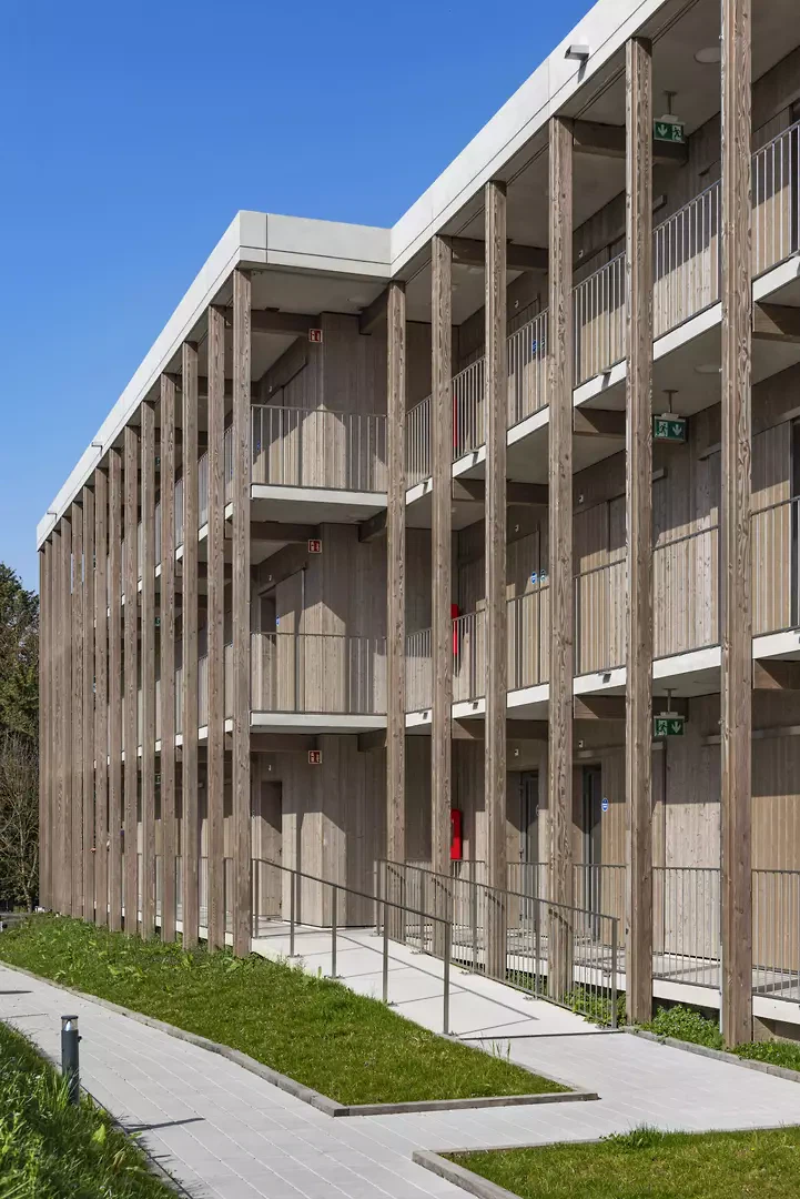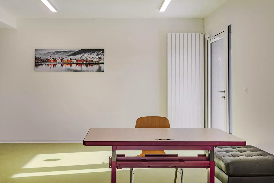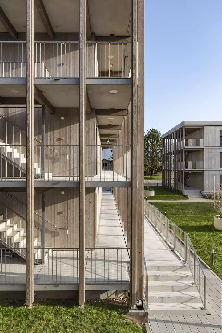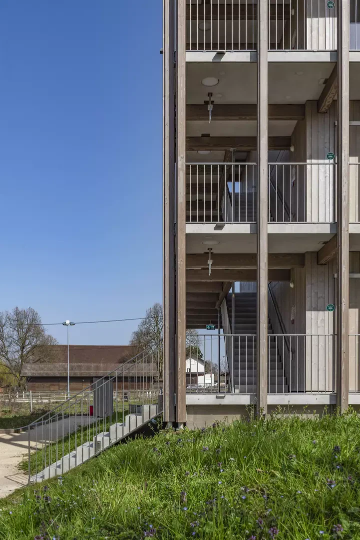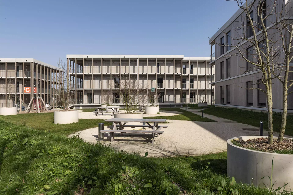 Die Wohnungen sind bewusst einfach gehalten und enthalten nur das Notwendigste: ein Schlafzimmer, ein Badezimmer, eine Küche und einen Aufenthaltsraum. Materialien und Farbtöne, neutral und warm, lassen Raum für die Aneignung durch die Bewohner*innen. Die Architektur schreibt keine Identität vor, sondern bietet einen offenen Rahmen, der angeeignet und verändert werden kann. Jede Einheit wird über einen aussenliegenden Laubengang erschlossen, der die Wohnungen miteinander verbindet und Begegnungsräume schafft. Dieses System steht in der Tradition der Laubenganghäuser, in denen Erschliessungsräume zu Erweiterungen des Wohnraums werden und gemeinschaftliche Räume eine strukturierende Rolle spielen. Die Gebäude sind durch einen landschaftlich gestalteten Weg verbunden, der zu einem zentralen Raum führt, dem eigentlichen Herz des Projekts. Dort befinden sich ein Kinderspielplatz sowie ein geschützter Aussenbereich, der Begegnungen zwischen den Bewohner*innen fördert. Das Erdgeschoss beherbergt die gemeinschaftlichen und administrativen Räume. Betreuer*innen begleiten dort die Bewohner durch Integrationsprogramme und erleichtern ihre Anpassung und Integration in die Gesellschaft. Dieses «Haus» stellt keinen Endpunkt dar, sondern einen Ausgangspunkt.