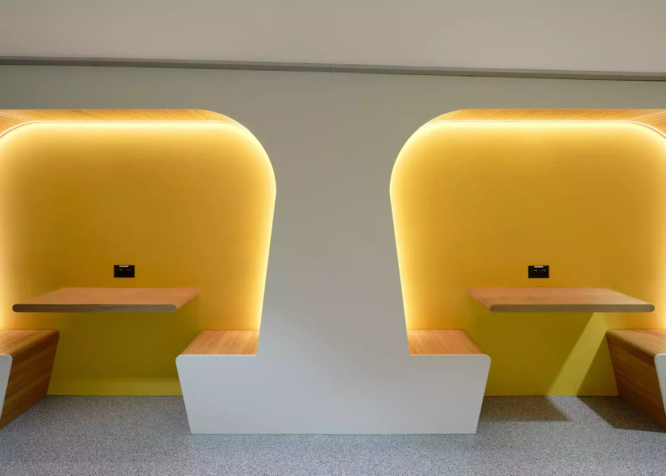 Am Boden treten runde Formen (Intarsien) als frei interpretierte Spiegelungen in Dialog mit der Decke. Der rezyklierte PVC-Bodenbelag wird nicht mit dem Untergrund verklebt und kann nach dem nächsten Erneuerungszyklus einfach wieder demontiert und zu 100 Prozent wieder rezykliert im Materialkreislauf erhalten werden. Die Verbindung beziehungsweise der Zwischenraum der beiden Teile Ost und West im Norden des 1. Untergeschoss mit niedriger Raumhöhe wird mit einer neuen vermietbaren Promotionsfläche mit hochwertiger Theke und Regal ergänzt. Im Teilbereich Ost werden zusätzliche vermietbare Promotionsflächen geschaffen. Die ehemalige Champions Alley wird mit einer neuen Nutzung, den «Working Spaces», attraktive Arbeitsnischen aufgeladen und soll mit einer aktiven Farbgebung einen neuen frischen Ausdruck erhalten. Die Mall wird auf allen Geschossen mit neu konzipierten Sitzmöbeln und grünen Aufenthaltsbereichen ausgestattet und ergänzt. Die aktuell verwendeten Möbel werden in einer ersten Variante umgebaut und mit neuem, hochwertigem Stoff bezogen oder in einer zweiten Variante werden neue Möbel aus den Rohstoffen (massives Eichenholz) der bisherigen Sitzmöbel und der Deckenbekleidung aus Holz erstellt. Die begrünten Zonen mit echten Pflanzen dienen als Erholungsort und geben dem Shopping-Center viel Frische und Bezug zur Aussenwelt. Bei den beiden Haupteingängen werden die Deckenelemente in den Atriumbereichen in das Gesamtkonzept eingebunden. Im Bereich West wird durch Demontage der Verkleidung die Stadiontribüne erlebbar. Die Tribünenuntersicht strahlt Blau und wird mit feinem Linienlicht beleuchtet. Die textile Verkleidung des Atriumtrichters im Bereich Ost wird erhalten und gleich wie das Pendant im Westteil eingebunden - in Blau strahlend und in Szene gesetzt mit feinem Linienlicht.