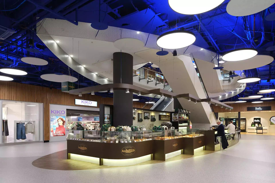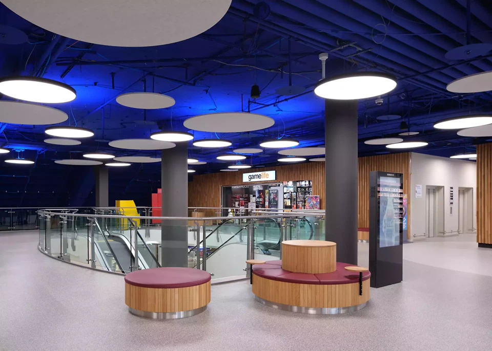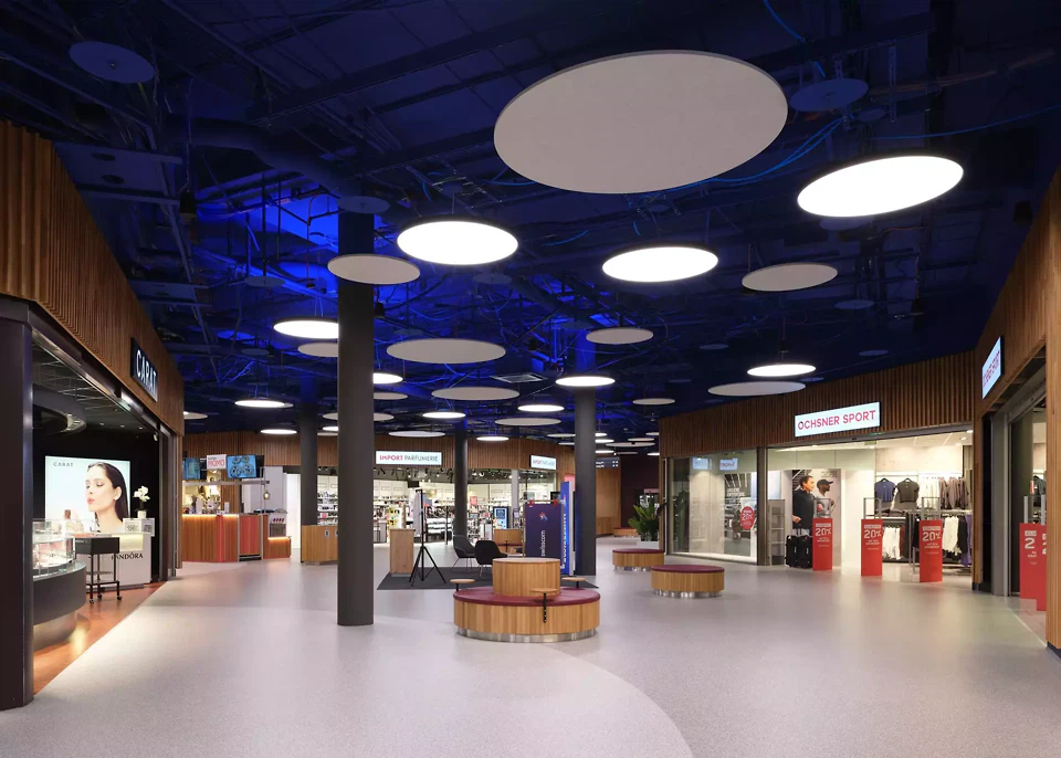 Die bereits in einem Refresh ausgeführte Wandbekleidung in Eichenholz der Shopfronten im Teil Ost bleiben aufgrund der Nachhaltigkeit, des guten Zustands sowie der zeitgemässen Ästhetik erhalten. Im Sinne der einheitlichen Gestaltung wird die Wandverkleidung der Shopfronten in Eichenholz im gesamten Shoppingcenter übernommen. Entsprechend dem Teils Ost, wird im Westteil die bestehende heruntergehängte Akustikdecke in Gips entfernt, so dass die grosszügige Raumhöhe erfahrbar wird. Sämtliche gut erhaltene Deckenelemente werden über einen Bauteilkatalog verfügbar gemacht und bleiben somit im Lebenszyklus. Die Decke und alle in dieser Ebene liegenden Installationen werden in der Farbe «Ultramarin» gestrichen. Dies steht als Synonym für den Himmel und soll eine grosse Tiefe erzeugen. Die Decke wird mit runden Beleuchtungskörpern (LED) bestückt, die mit diffusem und teilweise indirektem Licht eine hohe Aufenthaltsqualität erzeugen. Um eine angenehme, aktivierende Tageslichtwirkung mit Schattenspiel zu erzielen, werden zudem oberhalb den Mietausstellungsflächen Leuchten mit direktem Licht eingesetzt. Die Raumakustik wird mit runden Akustikpaneelen aus rezykliertem (Upcycling) PET aufgewertet und reagiert auf die unterschiedlichen Raumstimmungen. Die Akustikelemente werden in unterschiedlicher Ebene zu den Deckenleuchten gesetzt. Diese Vielschichtigkeit unterstreicht die Tiefenwirkung und die Analogie zum Himmel.