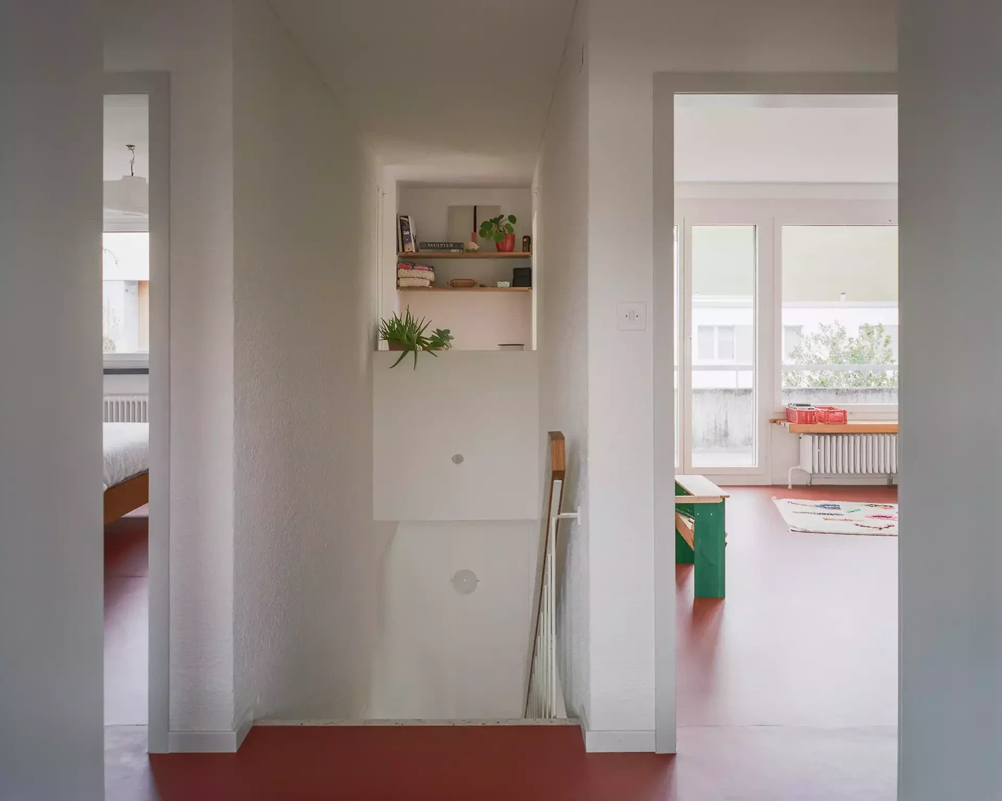 Im Obergeschoss bleibt die kompakte Organisation mit vier Schlafzimmern erhalten. Die funktionalen Beziehungen werden jedoch neu geordnet: Das Badezimmer erhält eine direkte Anbindung an die Ankleide, welche sich wiederum zum Flur öffnet. Durch die Verlagerung eines Einbauschranks entsteht im zentralen Erschliessungsbereich Raum für eine Sitzbank. Diese fungiert als Ort des informellen Zusammenkommens und ermöglicht zugleich den Einfall von Morgenlicht. Über dem Treppenraum wurde eine Wand bis auf Brüstungshöhe zurückgebaut. Ein zusätzlicher Durchgang schafft eine visuelle und räumliche Verbindung über dem Treppenkern, generiert ein spielerisches Rückzugsversteck und führt Tageslicht in den zuvor dunklen Treppenabgang.