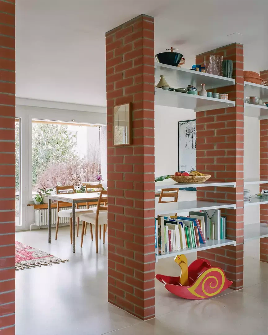 Das Material- und Farbkonzept basiert auf einem bewussten Dialog zwischen Bestand und Intervention. Das Sichtmauerwerk, der ultramarinblaue Küchentisch sowie die graulackierten Holzoberflächen treten in Beziehung zu den bestehenden Putzen und Texturen. Die neuen Elemente behaupten sich eigenständig, ohne den historischen Kontext zu überlagern. Vielmehr entsteht eine atmosphärische Kontinuität, in der Alt und Neu nicht im Kontrast stehen, sondern sich komplementär ergänzen. Die originale Metallküche von Forster aus den 1970er-Jahren wurde in die neue Schreinerküche integriert und verdeutlicht, wie viel Qualität und Langlebigkeit in ihr steckt. Einzelne tragende Wände wurden durch gemauerte Pfeiler ersetzt. Anstelle eines raumhöhenreduzierenden Stahlträgers lagern die vertikalen Elemente auf einer durchlaufenden Deckenfläche, wodurch die Raumhöhe erhalten und eine maximale Lichtführung ermöglicht wird. Die Pfeiler übernehmen dabei eine doppelte Funktion: Sie sind sowohl Teil der Tragstruktur als auch integraler Bestandteil eines Einbaumöbels in Form einer Durchreiche. Konstruktion und Möblierung werden so zu einer ökonomischen und gestalterischen Einheit verschränkt.