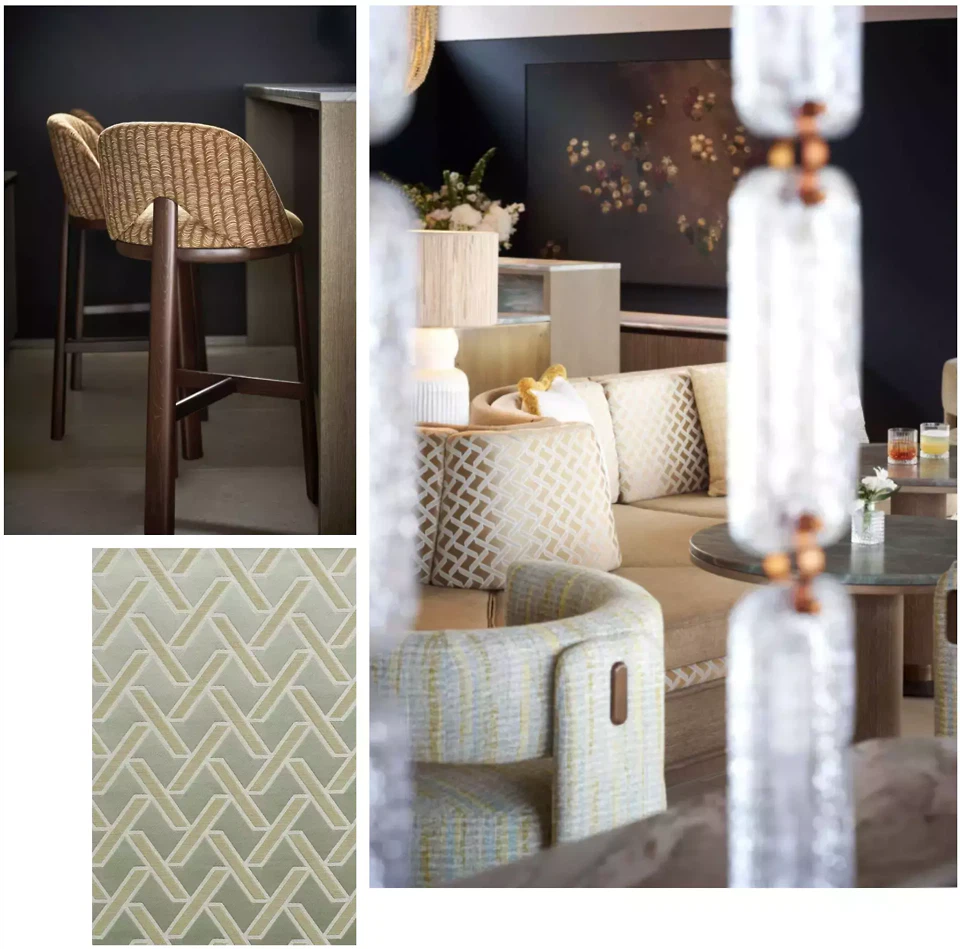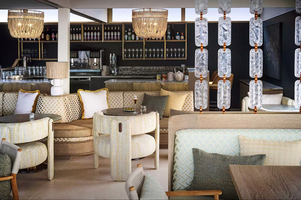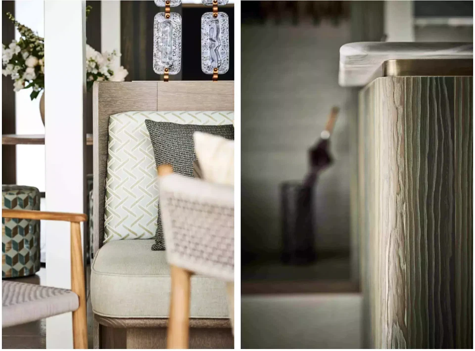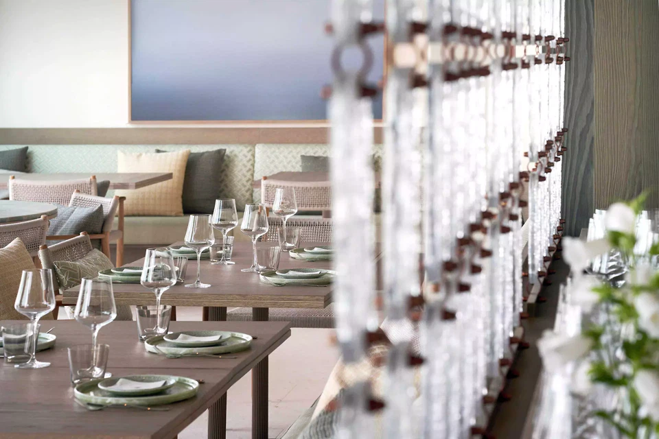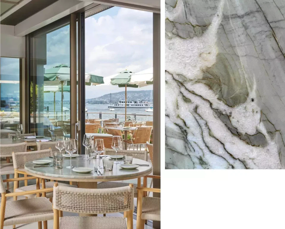 Diese sensible Neugestaltung würdigt die ursprüngliche Pavillonstruktur und verleiht ihr gleichzeitig einen frischen, modernen Charakter. Klare architektonische Linien und grosszügige Fenster wurden verbessert, um die Grenze zwischen Innenraum und See zu verwischen. Massgefertigte Elemente – wie tiefgrüne Douglasienholzschränke und handgefertigte Servicestationen, die von durchscheinenden Glasbausteinen umrahmt sind – verleihen dem Raum einen ruhigen, unverwechselbaren Charakter. Helle Kalksteinböden erinnern an sonnenverwöhnte mediterrane Terrassen. Esmerald Jadore-Quarzit-Esstische reflektieren die schimmernde Wasseroberfläche. Gepolsterte Bänke aus gemustertem Dedar-Stoff erinnern an die entspannte Eleganz von Strandclubs aus der Mitte des Jahrhunderts, neu interpretiert mit einem modernen, zurückhaltenden Touch.