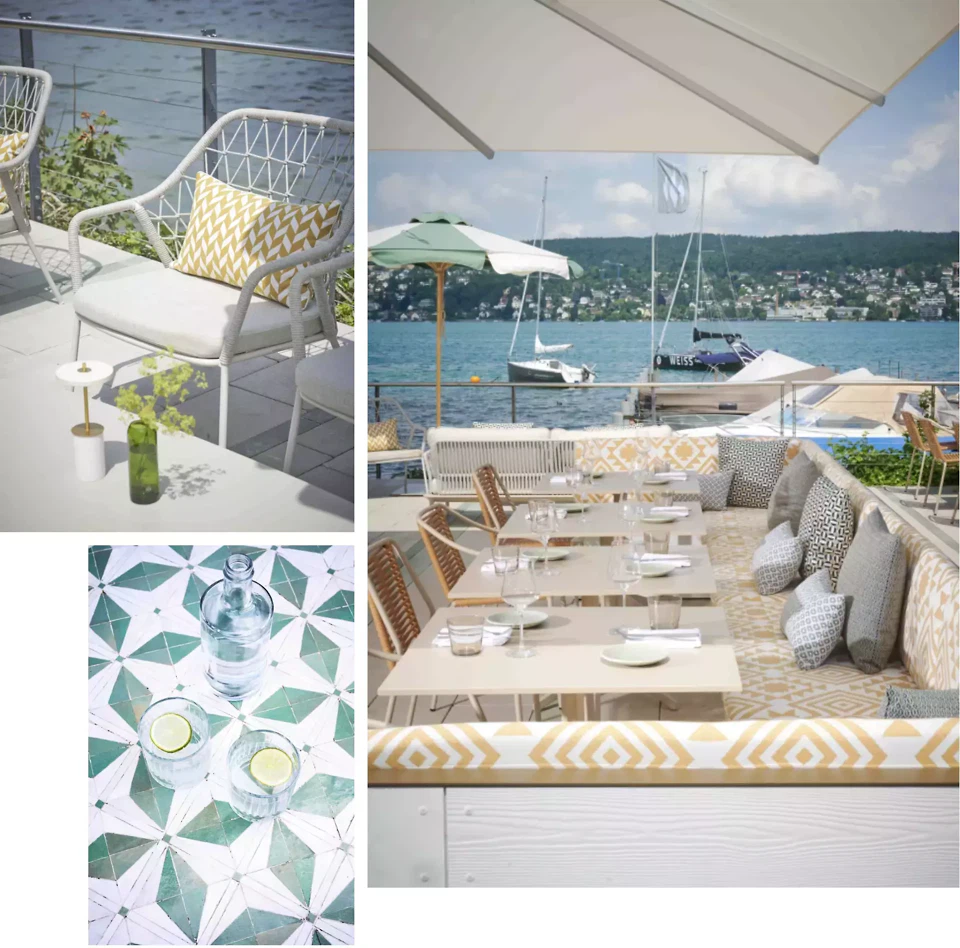 Mit Blick auf das ruhige Wasser des Zürichsees ist das Chez Fritz in Kilchberg seit seiner Gründung im Jahr 1963 ein beliebtes Ausflugsziel. In diesem Sommer öffnet das legendäre Restaurant am Seeufer mit neuem Elan und einer sorgfältig von unserem Studio neu gestalteten Inneneinrichtung wieder seine Türen – entwickelt in enger Zusammenarbeit mit Property One.